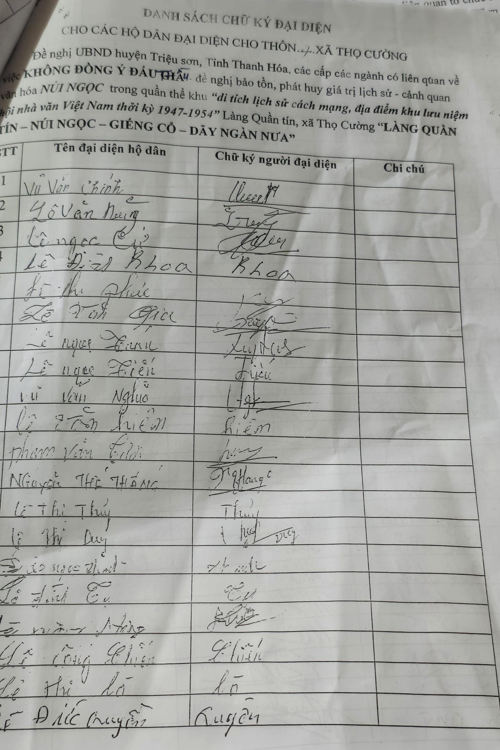 Danh sách chữ ký đại diện cho nhân dân xã Thọ Cường ký vào đơn gửi các cơ quan chức năng, không đồng ý quy hoạch, đấu giá mỏ đất núi Ngọc. Ảnh: Văn Thanh