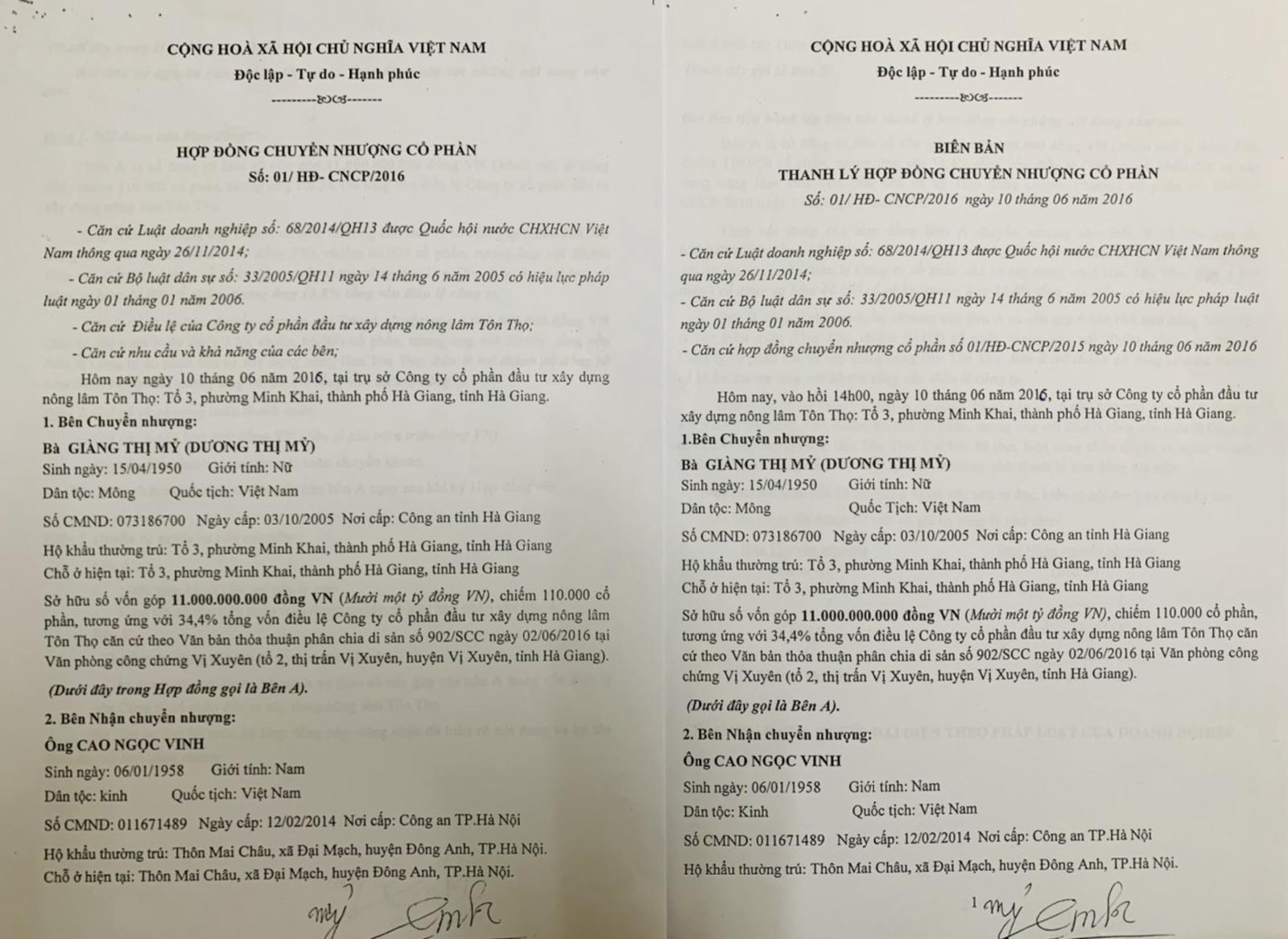 Ngày 10/6/2016, bà Giàng Thị Mỹ (Dương Thị Mỹ), tổ 3, phường Minh Khai, TP Hà Giang, tỉnh Hà Giang, vợ của ông Dương Minh Chương (nguyên là cổ đông sáng lập, Chủ tịch HĐQT, người đại diện pháp luật của Cty Tôn Thọ, mất tháng 8/2013), bên chuyển nhượng (bên A) và ông Cao Ngọc Vinh, thôn Mai Châu, xã Đại Mạch, huyện Đông Anh, Hà Nội, bên nhận chuyển nhượng (bên B) đã ký kết Hợp đồng Chuyển nhượng cổ phần số 01/HĐ-CNCP/2016.