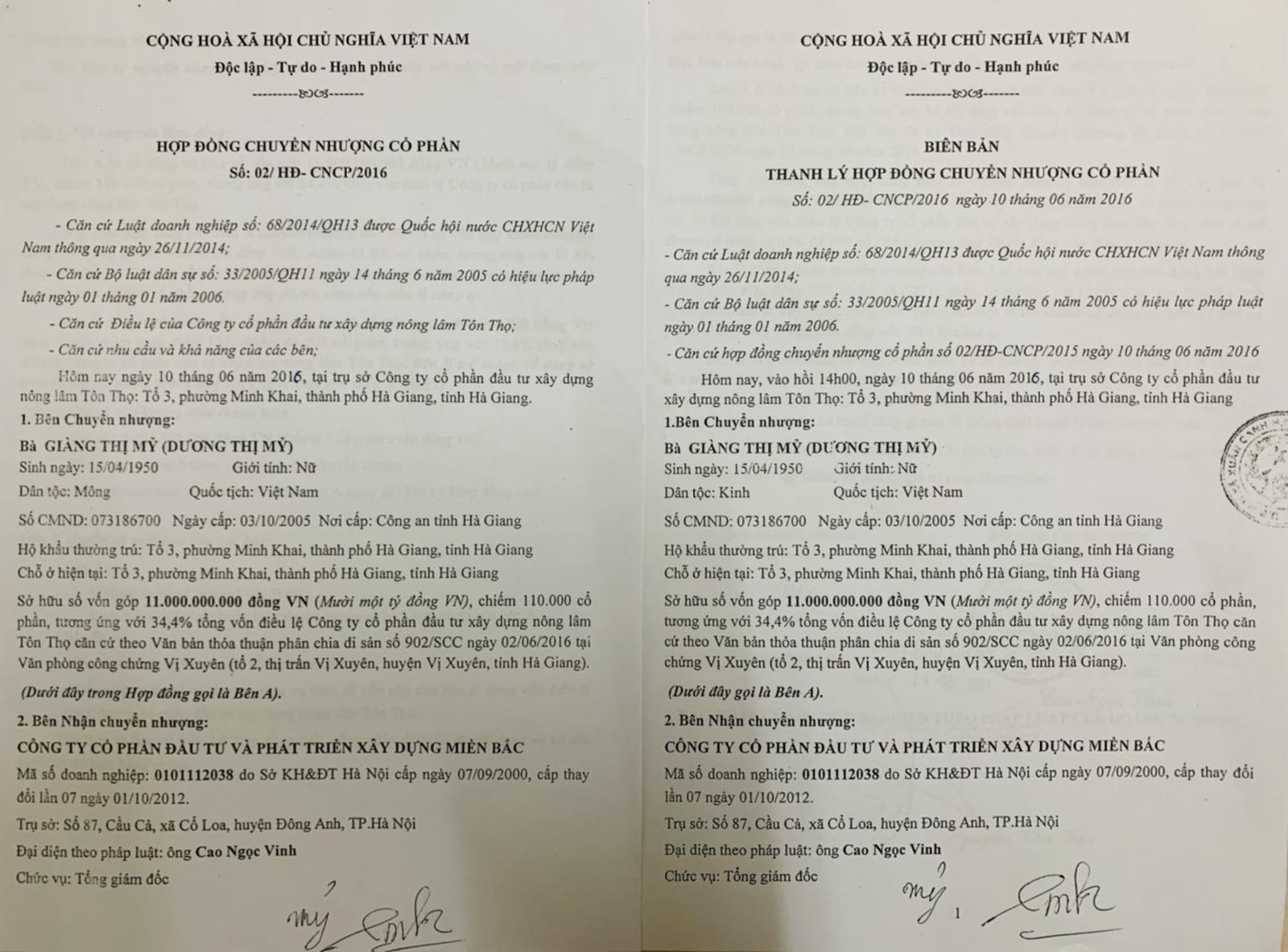 Cùng ngày, bên A - bà Giàng Thị Mỹ (Dương Thị Mỹ) và bên B - Công ty Cổ phần Đầu tư và Phát triển xây dựng Miền Bắc do ông Cao Ngọc Vinh đại diện theo pháp luật đã ký kết Hợp đồng Chuyển nhượng cổ phần số 02/HĐ-CNCP/2016.
