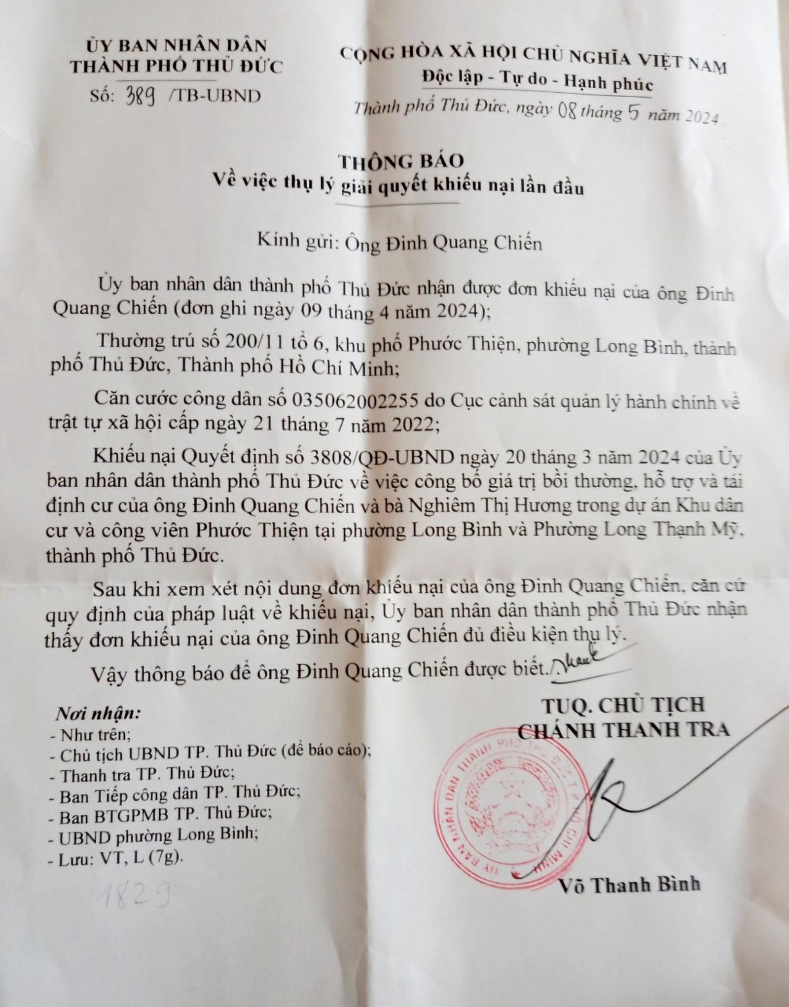 Trong khi chờ chỉ đạo của lãnh đạo Quận 9 giải quyết khiếu nại “quyết định thu hồi đất”, thì UBND TP Thủ Đức (nhập từ 3 quận là Quận 2, 9, Thủ Đức) tiếp tục ban hành Quyết định 3808/QĐ-UBND ngày 20/3/2024 về việc công bố giá trị bồi thường, hỗ trợ và tái định cư của ông Đinh Quang Chiến và bà Nghiêm Thị Hương trong dự án khu dân cư và công viên Phước Thiện tại phường Long Bình và phường Long Thạnh Mỹ, TP Thủ Đức. Ông Đỗ Văn Reo cũng nhận được Quyết định số 3396/QĐ-UBND ngày 11/3/2024 của UBND TP Thủ Đức.