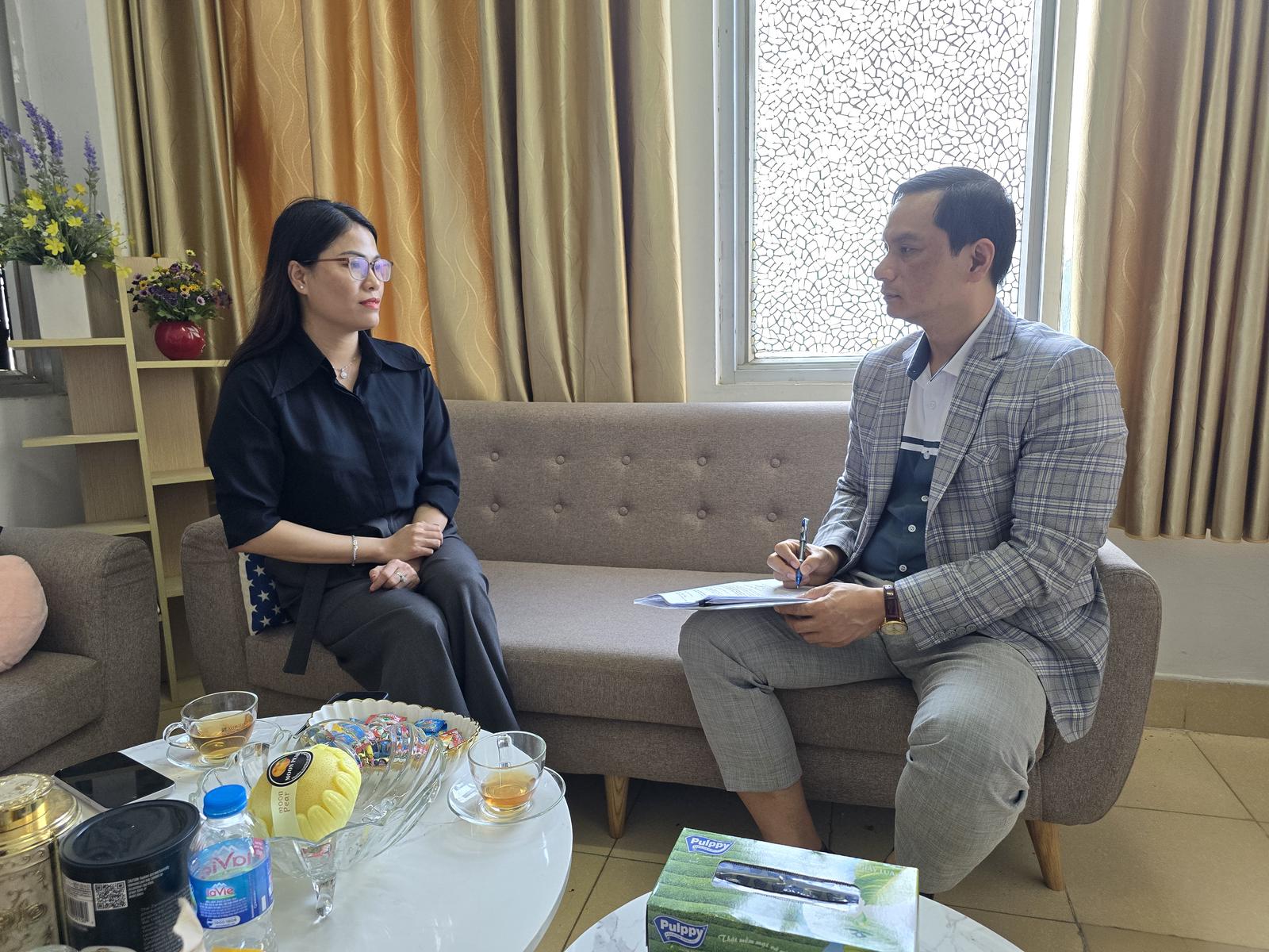 Bà Nguyễn Ngọc Linh Chi, Giám đốc Công ty Nhất An Phú (bên trái) trao đổi với phóng viên Báo Thanh tra về cuộc đấu giá mỏ đất núi Ngọc, xã Thọ Cường. Ảnh: Văn Thanh
