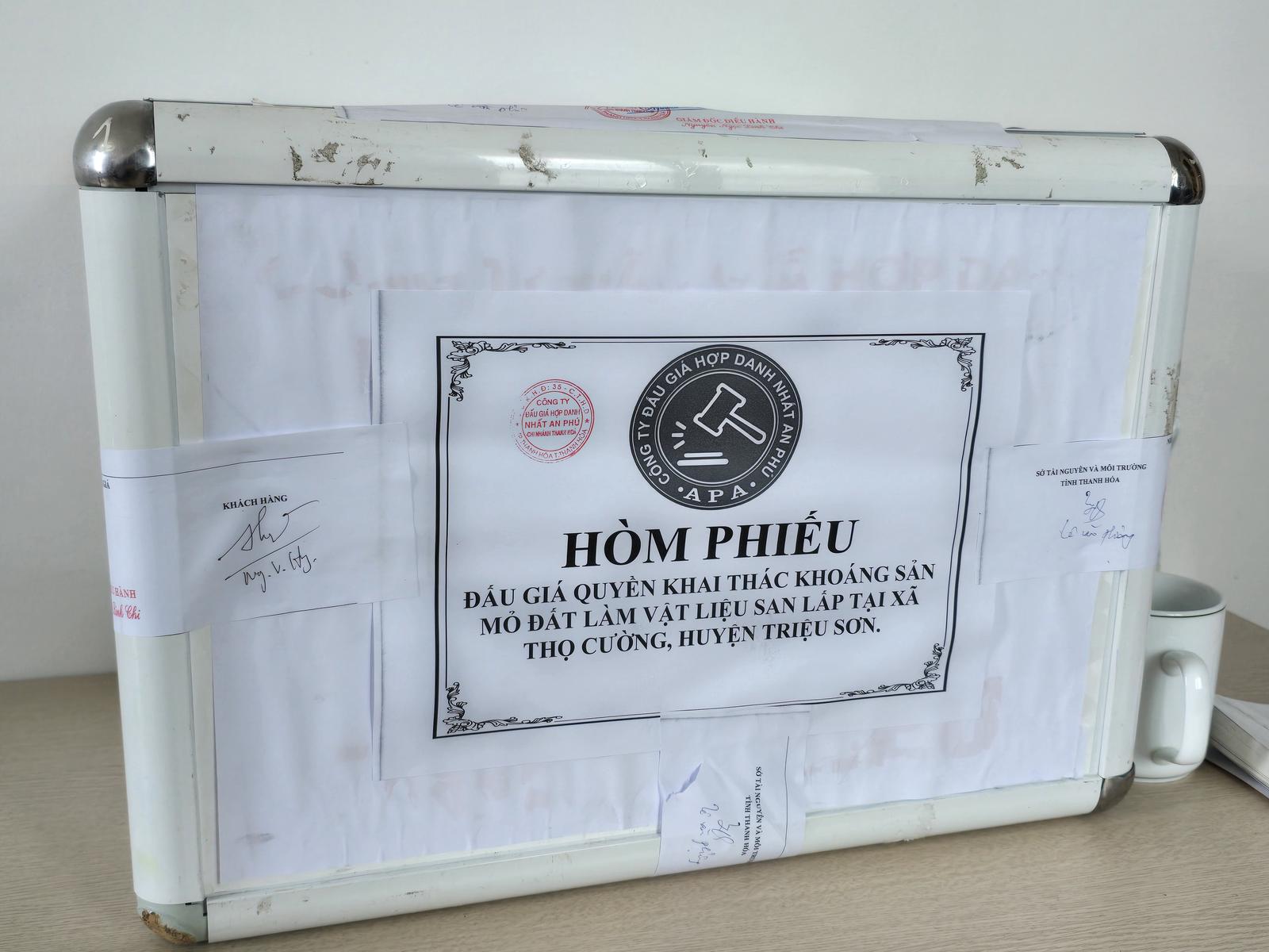 Hòm phiếu đã niêm yết các đơn vị trả giá trong cuộc đấu giá mỏ đất núi Ngọc, xã Thọ Cường đang được cất giữ tại Công ty Đấu giá Nhất An Phú. Ảnh: Văn Thanh
