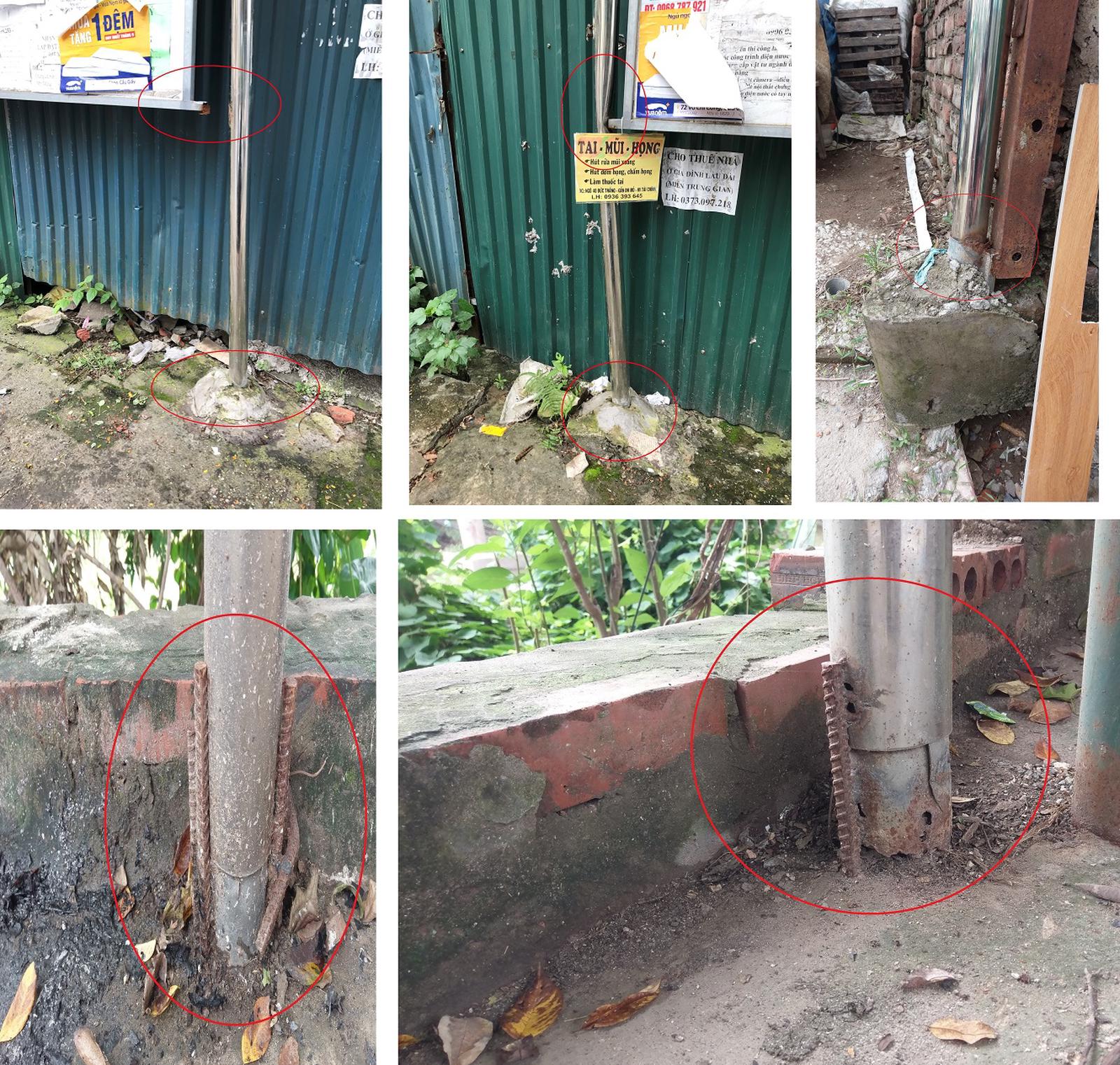 Hình ảnh những cột inox mới thay đã hỏng kèm những chân cột bê tông sơ sài, cột inox bó bột ngồi trên cột thép cũ khiến công dân nghi ngờ việc tiếp tục bị rút ruột ngay trong quá trình tráo đổi lại vật liệu inox