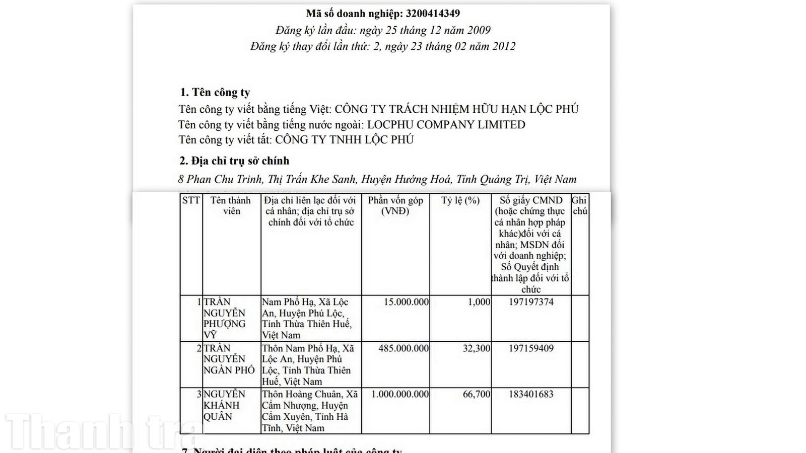Không chỉ là “mối quan hệ huyết thống”, hồ sơ đăng ký kinh doanh của Công ty Lộc Phú cho thấy sự gắn bó lợi ích tài chính giữa doanh nghiệp này và gia đình ông Quân kéo dài suốt nhiều năm. Năm 2012, ông Quân góp vốn 1 tỷ đồng, chiếm 66,7% vốn điều lệ; vợ ông Quân là bà Trần Nguyễn Ngàn Phố góp 485 triệu đồng, tương ứng 32,3%.