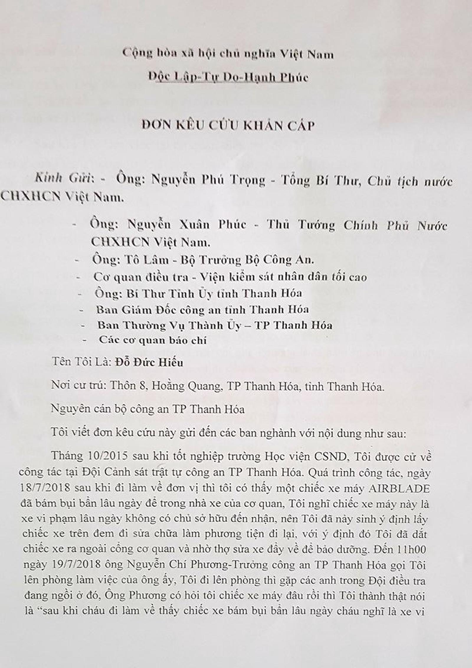 Nội dung đơn thư xuất hiện trên mạng xã hội facebook đứng tên ông Đỗ Đức Hiếu, nguyên cán bộ Đội Cảnh sát trật tự (CSTT), Công an TP Thanh Hóa tố cáo ông Phương như sau: Vào 10/2015, sau khi tôi tốt nghiệp Trường Học viện Cảnh sát Nhân dân tôi được cử về Đội CSTT, Công an TP Thanh Hóa. Quá trình công tác, ngày 18/7/2018, sau khi đi làm về đơn vị, tôi có thấy chiếc xe máy Airblade đã bám bụi bẩn lâu ngày để trong nhà xe của cơ quan. Tôi nghĩ chiếc xe máy này là xe vi phạm lâu ngày không có chủ sở hữu đến nhận nên tôi đã nảy sinh ý định lấy chiếc xe đem đi sửa chữa làm phương tiện đi lại. Với ý định đó tôi đã dắt chiếc xe ra cổng cơ quan và nhờ thợ sửa xe đẩy về để bảo dưỡng.