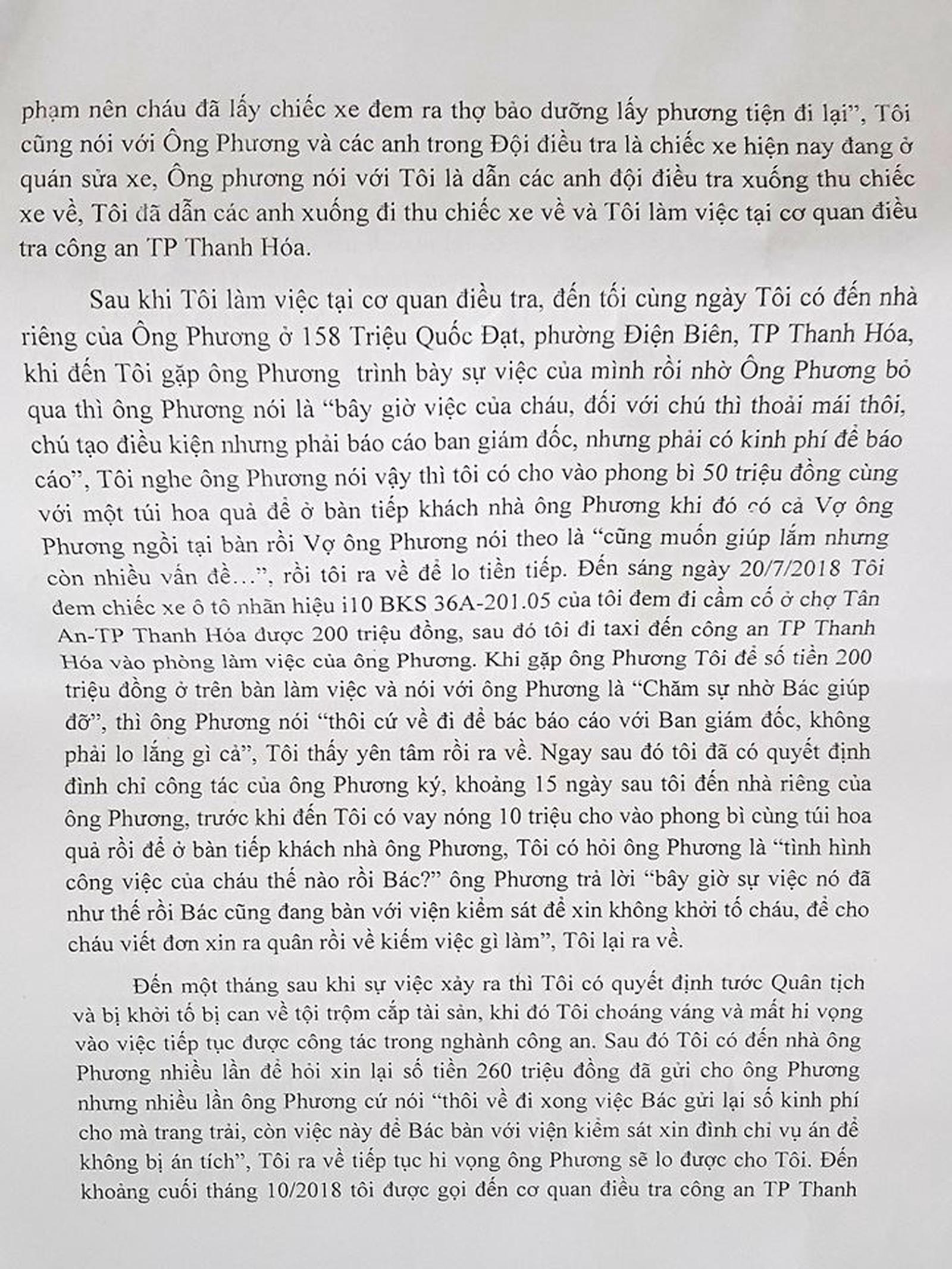 Đến sáng ngày 20/7, tôi mang chiếc xe nhãn hiệu i10 BKS 36A-201.05 đi cầm cố được 200 triệu. Sau đó tôi đi xe taxi đến Công an TP Thanh Hóa và vào phòng làm việc của ông Phương gặp ông Phương tôi để lại số tiền 200 triệu đồng ở trên bàn làm việc và nói với ông Phương là “chăm sự nhờ bác giúp đỡ” thì ông Phương nói thôi cứ về đi để bác báo cáo với Ban Giám đốc không phải lo lắng gì cả, tôi yên tâm ra về.