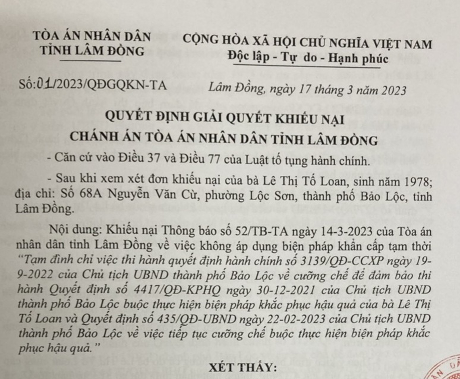 Chỉ 1 ngày sau khi cưỡng chế, ngày 17/3/2023, TAND tỉnh Lâm Đồng đã có Quyết định số 01/2023/QĐGQKN-TA giải quyết khiếu nại của bà Lê Thị Tố Loan khiếu nại Thông báo số 52/TB-TA ngày 14/3/2023 của TAND tỉnh Lâm Đồng về việc không áp dụng biện pháp khẩn cấp tạm thời: “Tạm đình chỉ việc thi hành quyết định hành chính số 3139/QĐ-CCXP ngày 19/9/2022 của Chủ tịch UBND TP Bảo Lộc về cưỡng chế để đảm bảo thi hành Quyết định số 4417/QĐ-KPQH ngày 30/12/2021 của Chủ tịch UBND TP Bảo Lộc buộc thực hiện biện pháp khắc phục hậu quả của bà Lê Thị Tố Loan và Quyết định 435/QĐ-UBND ngày 22/2/2023 của Chủ tịch UBND TP Bảo Lộc về việc tiếp tục cưỡng chế buộc thực hiện biện pháp khắc phục hậu quả”.