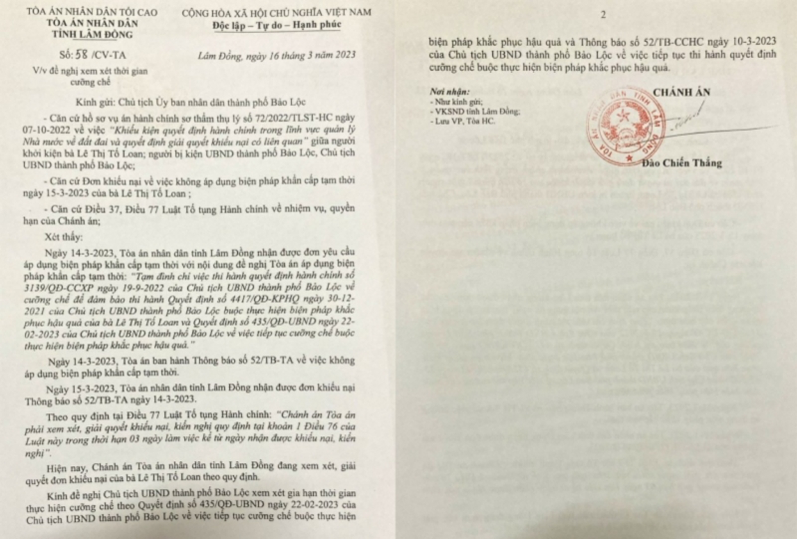 Công văn gửi của TAND tỉnh Lâm Đồng do Chánh án Đào Chiến Thắng ký ngày 16/3/2023, gửi Chủ tịch UBND TP Bảo Lộc về việc đề nghị xem xét thời gian cưỡng chế. Thế nhưng sáng cùng ngày, lực lượng chức năng TP Bảo Lộc đã tiến hành cưỡng chế công trình của người dân.
