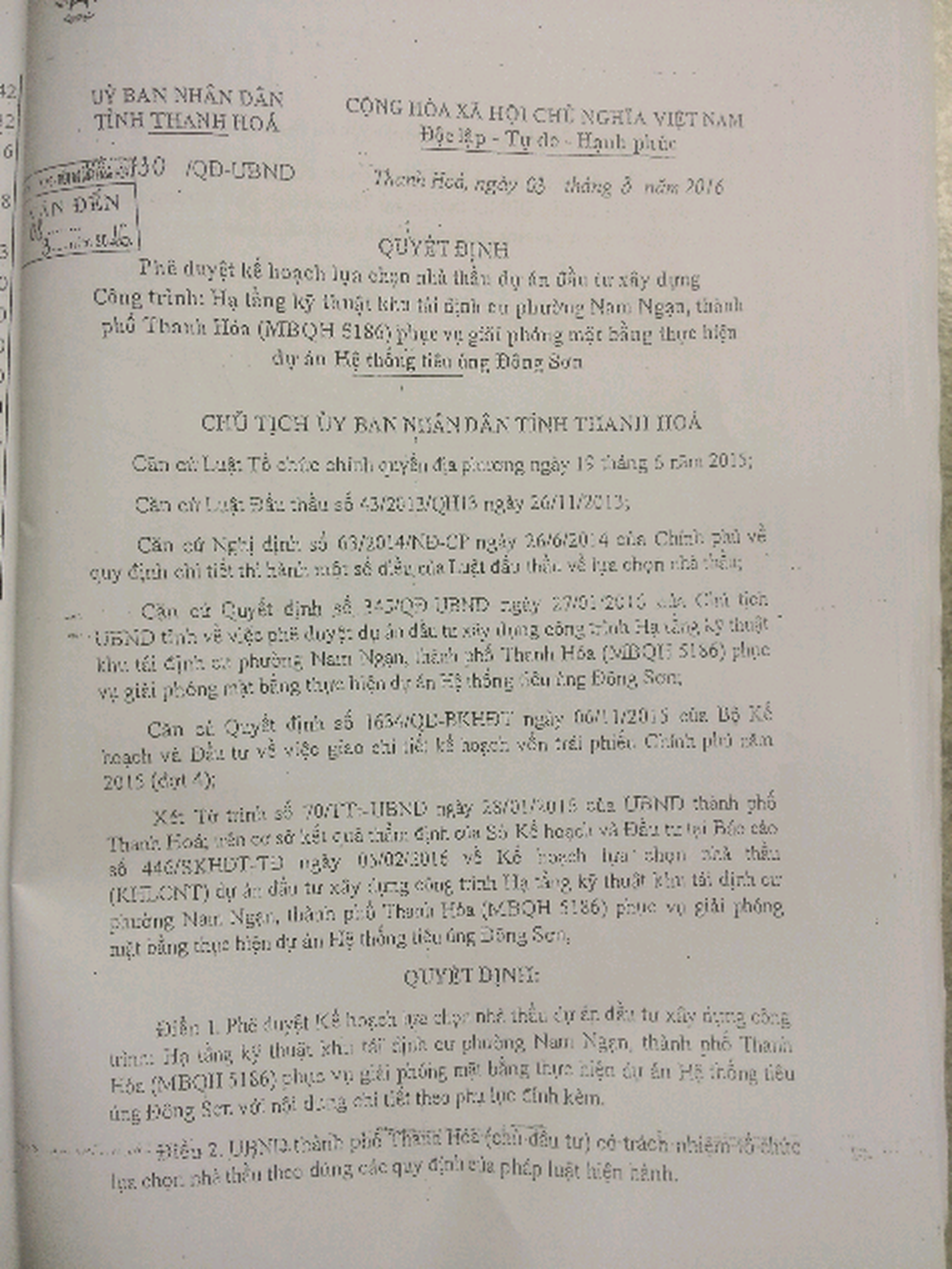 Quyết định phê duyệt kế hoạch lựa chọn nhà thầu đầu tư dự án. Ảnh: Văn Thanh