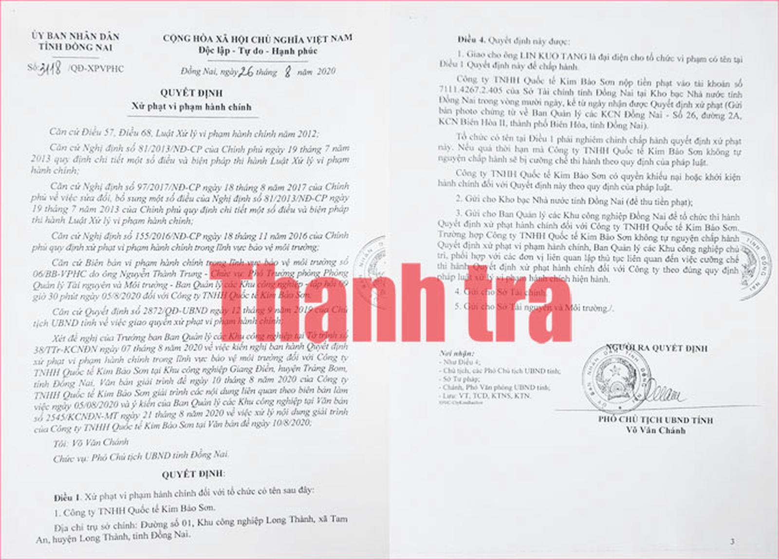 Cũng tại KCN Giang Điền, huyện Trảng Bom, vào tháng 8/2020, Công ty TNHH Quốc tế Kim Bảo Sơn đã bị UBND tỉnh Đồng Nai ra quyết định xử phạt hành chính do hành vi không có giấy xác nhận hoàn thành công trình bảo vệ môi trường phục vụ giai đoạn vận hành theo quy định.