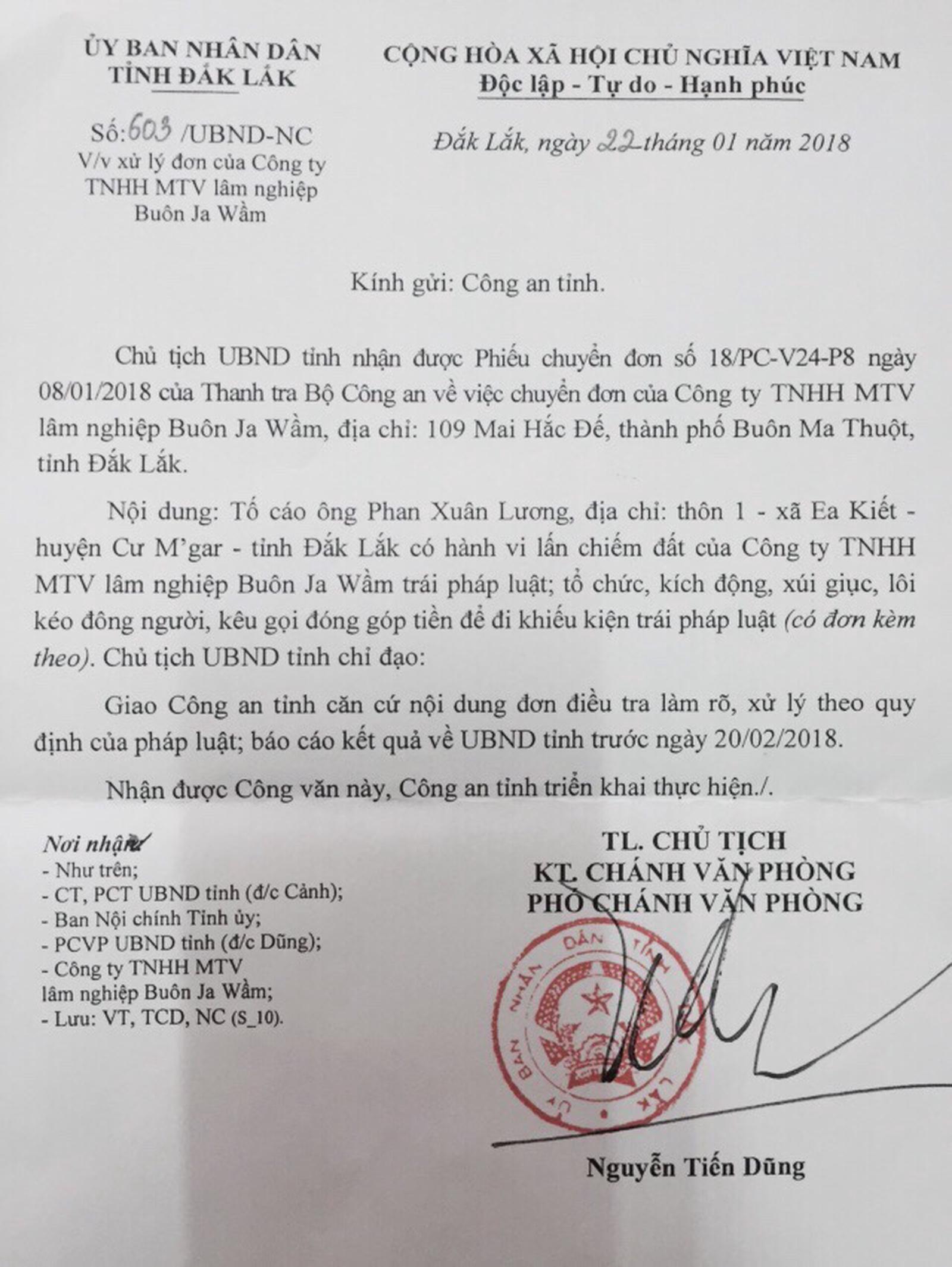 Sau khi Báo Thanh tra đăng tải loạt bài phản ánh xung quanh vụ lấn chiếm đất của Nhà nước, xúi giục, kích động người dân vi phạm pháp luật tại xã Ea Kiết, để sáng tỏ và công minh sự vụ trước pháp luật, UBND tỉnh Đắk Lắk đã liên tiếp có các Công văn 221/UBND ngày 10/1/2018 và Công văn 603UBND-NC ngày 22/1/2018, chỉ đạo các cơ quan, đơn vị liên quan, đồng thời yêu cầu Công an tỉnh Đắk Lắk chỉ đạo các phòng chức năng bám sát tình hình diễn biến, tổ chức điều tra, kiên quyết đưa các hành vi, vi phạm ra xử lý nghiêm minh trước pháp luật…