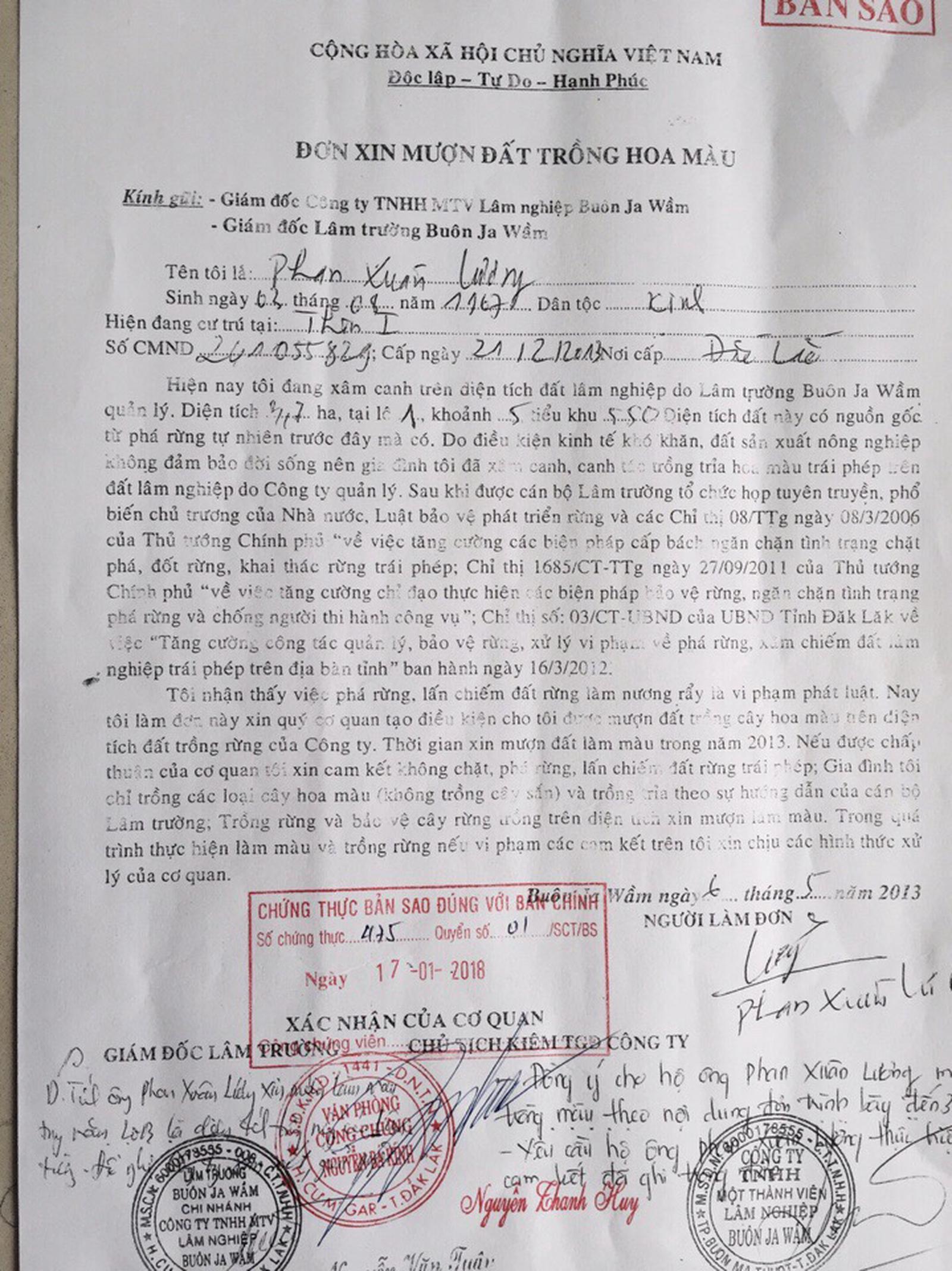 Đơn xin mượn đất trồng hoa màu đề năm 2013 của ông Phan Xuân Lương. Ảnh Nhóm PV