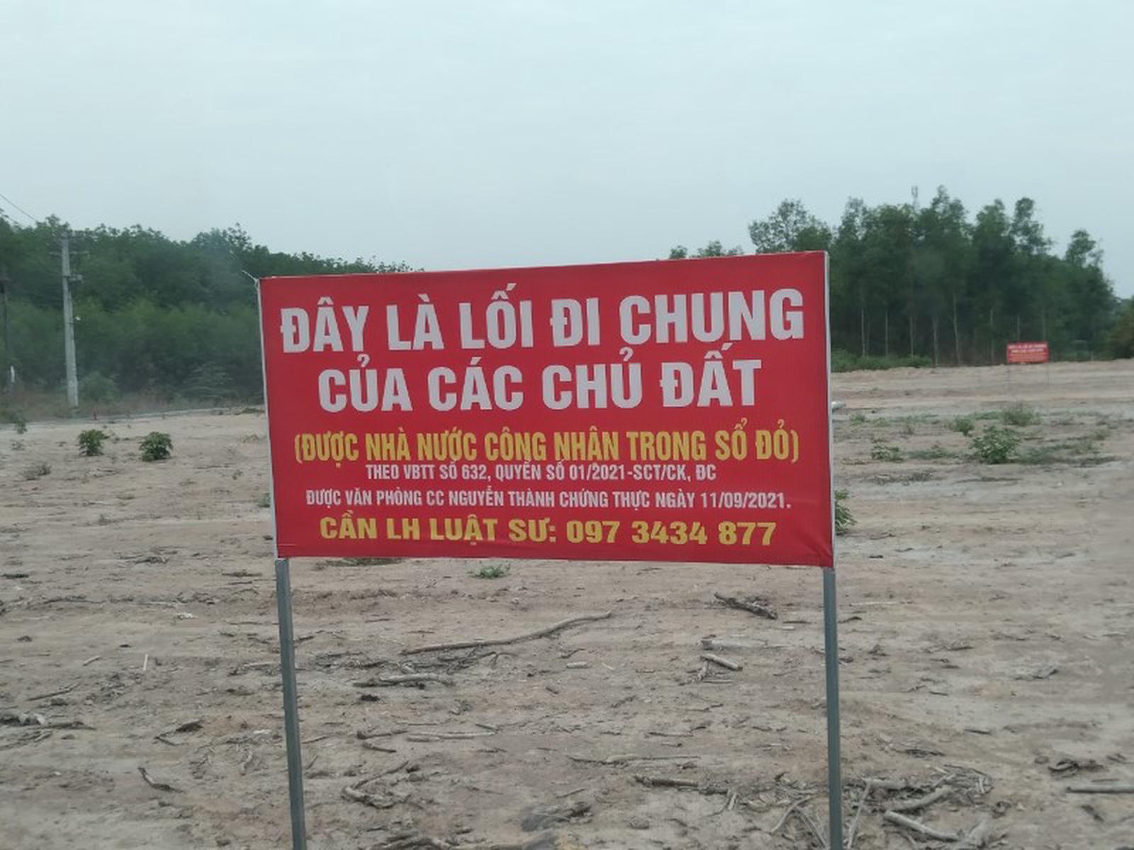 Lách luật bằng cách dựng bảng cho rằng “đây là lối đi chung….”, rồi đổ đá, làm đường trên đất nông nghiệp, phân lô đem bán. Ảnh: Nguyên Dũng