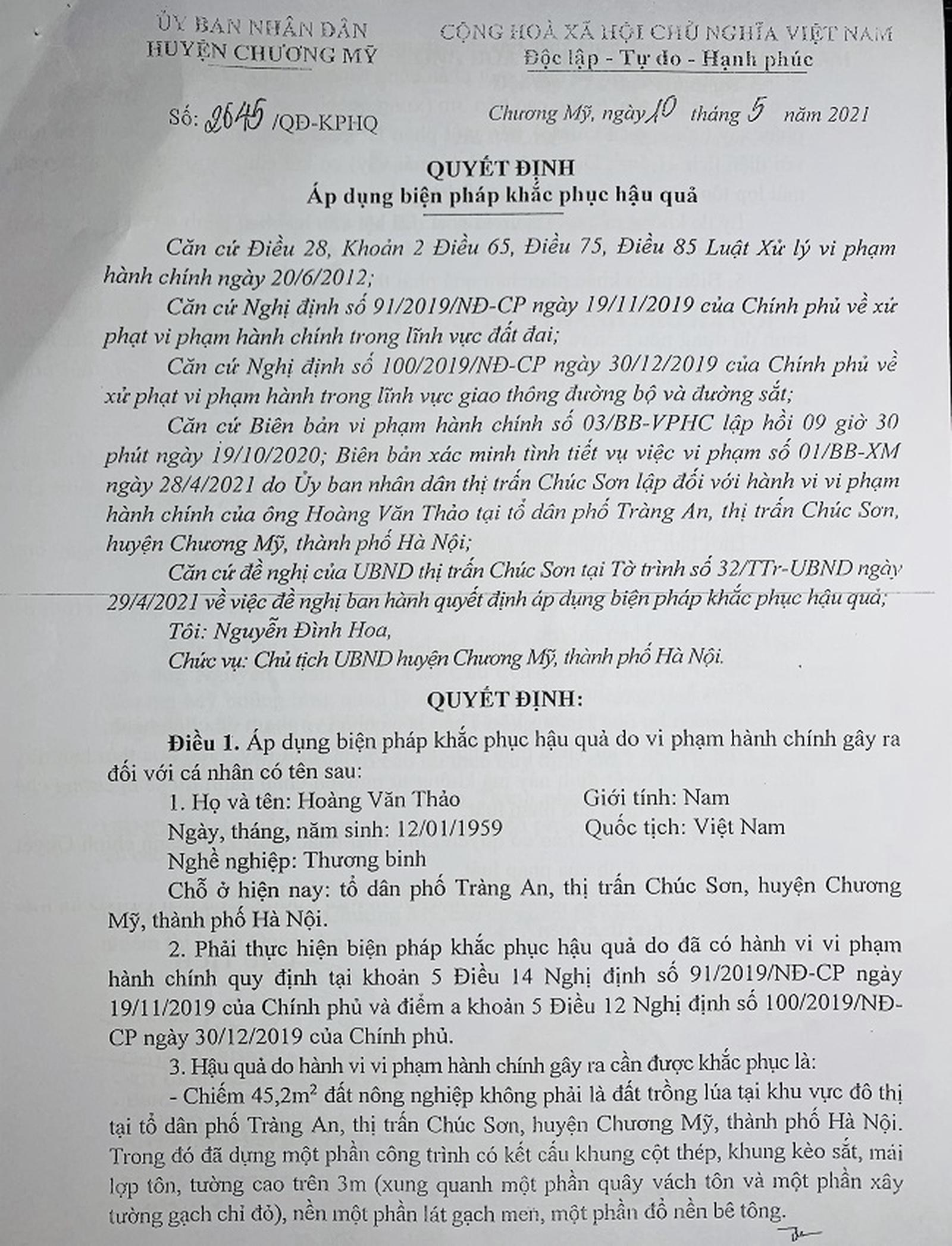 Ngày 10/5/2021, Chủ tịch UBND huyện chương Mỹ đã ban hành Quyết định số 2645 áp dụng biện pháp khắc phục hậu quả đối với ông Hoàng Văn Thảo nhưng ông Thảo không chấp hành.