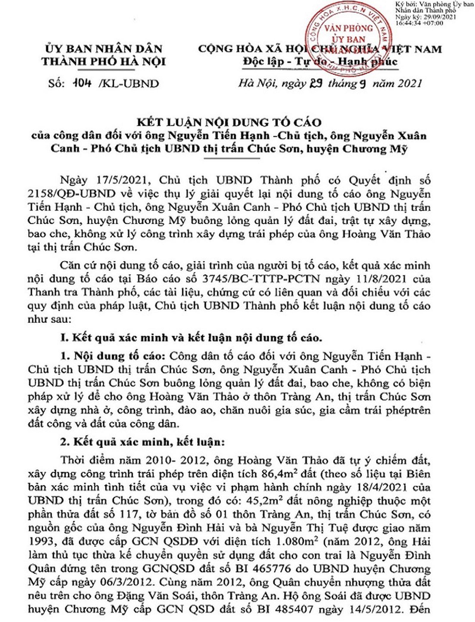 Ngày 29/9/2021, UBND TP Hà Nội ban hành Kết luận số 104 về nội dung công dân tố cáo đối với ông Nguyễn Tiến Hạnh - Chủ tịch, ông Nguyễn Xuân Canh - Phó Chủ tịch UBND thị trấn Chúc Sơn buông lỏng quản lý đất đai, bao che, không có biện pháp xử lý để cho ông Hoàng Văn Thảo ở thôn Tràng An, thị trấn Chúc Sơn xây dựng nhà ở, công trình, đào ao, chăn nuôi gia súc, gia cầm trái phép trên đất công và đất của công dân.