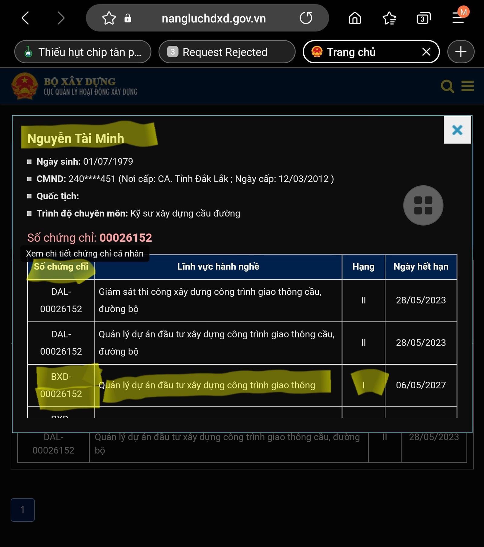 Sự việc đang trong quá trình được cơ quan chức năng làm rõ, xử lý xi phạm, nhưng qua tìm hiểu, phóng viên nhận thấy một số điểm bất hợp lý là trên website của Cục Quản lý hoạt động xây dựng (www.nangluchdxd.gov.vn) lại có các tên của 5 cán bộ nêu trên được cấp chứng chỉ hành nghề.