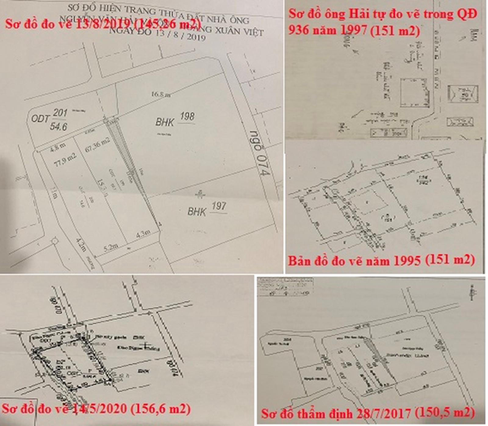 Các sơ đồ, bản đồ có diện tích và độ dài cạnh thửa được các cơ quan chức đo vẽ khác nhau. Ảnh: TH