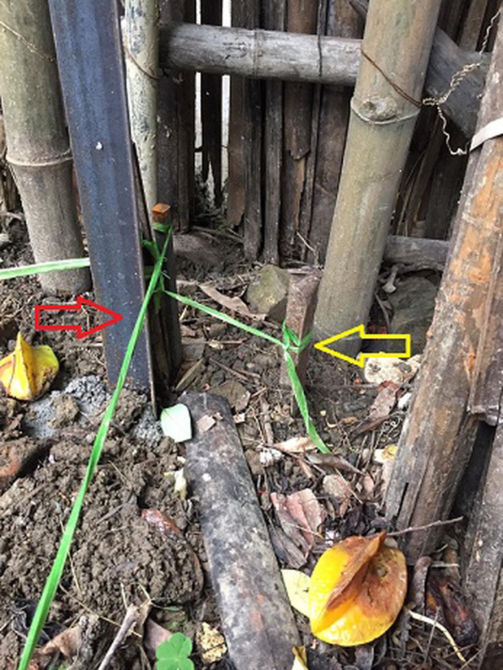 Mốc có mũi tên màu vàng theo sơ đồ hiện trạng thửa đất ngày 13/8/2019, mốc có mũi tên màu đỏ là theo biên bản cưỡng chế thi hành án ngày 29/10/2021. Ảnh: TH