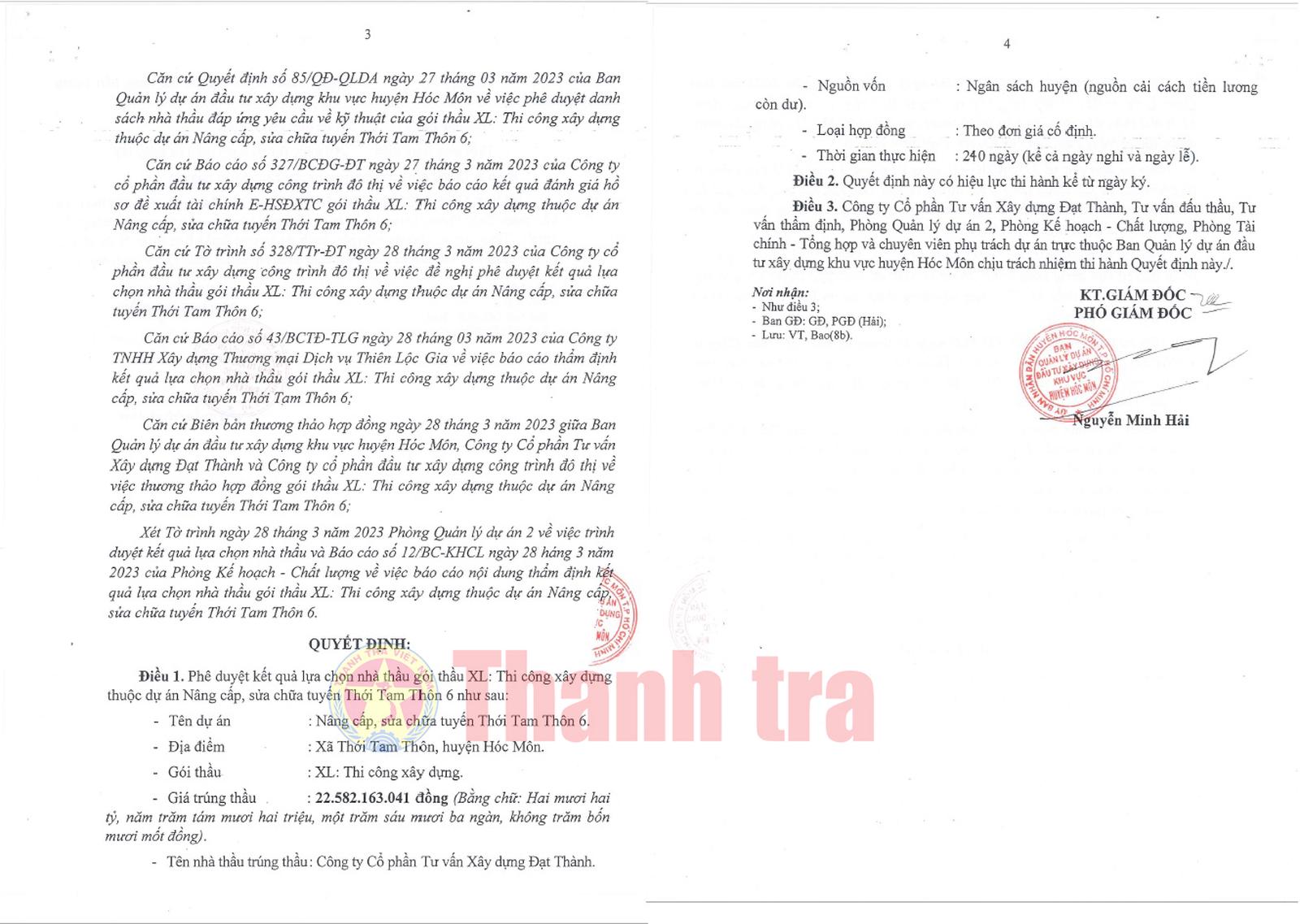 Ngày 28/3/2023, ông Nguyễn Minh Hải - Phó Giám đốc BQLDA huyện Hóc Môn đã ký quyết định phê duyệt công ty này trúng thầu với giá trúng thầu là hơn 22,582 tỷ đồng (giá gói thầu là hơn 22,639 tỷ đồng); tiết kiệm ngân sách Nhà nước được hơn 57 triệu đồng, tương đương 0,25% giá gói thầu.