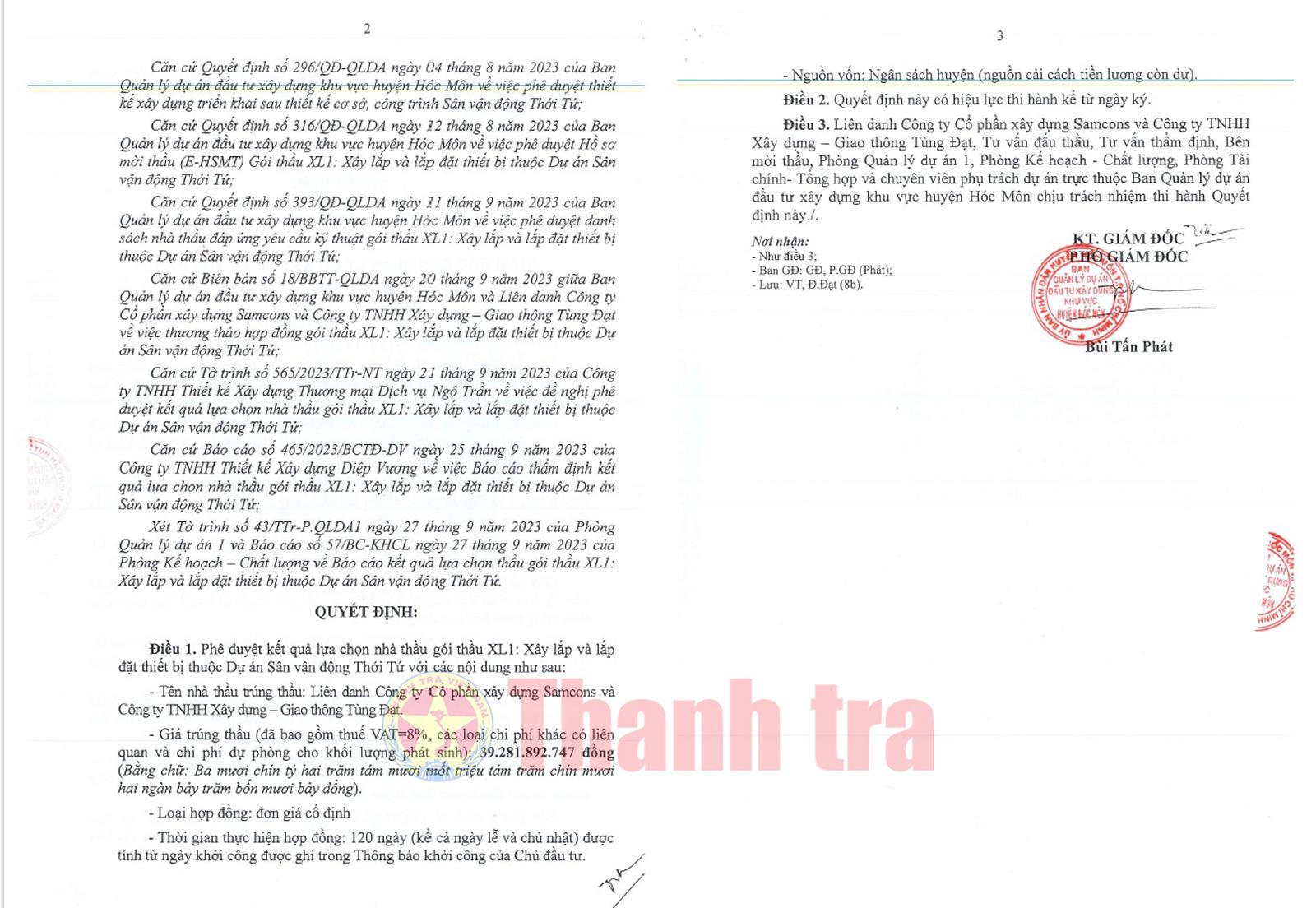 Ngày 27/9/2023, ông Bùi Tấn Phát - Phó Giám đốc BQLDA huyện Hóc Môn đã ký quyết định cho liên danh này trúng thầu với giá trúng thầu là hơn 39,281 tỷ đồng (giá gói thầu là hơn 29,36 tỷ đồng); tiết kiệm cho ngân sách Nhà nước được hơn 78 triệu đồng, tương đương gần 0,2% giá trị gói thầu.