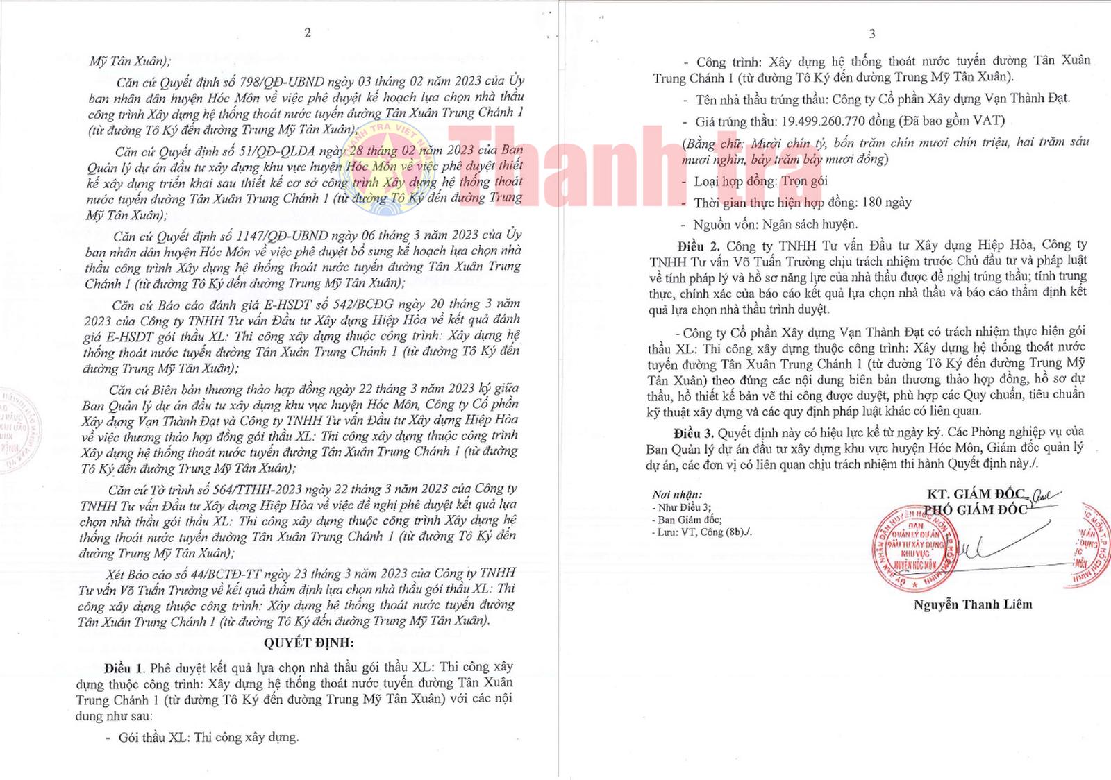 Ngày 23/3/2023, ông Nguyễn Thanh Liêm - Phó Giám đốc BQLDA huyện Hóc Môn đã ký quyết định phê duyệt cho Công ty CP Xây dựng Vạn Thành Đạt trúng thầu với giá trúng thầu là hơn 19,499 tỷ đồng (giá gói thầu là hơn 19,54 tỷ đồng); tiết kiệm ngân sách Nhà nước được hơn 40 triệu đồng, tương đương 0,21% giá gói thầu.