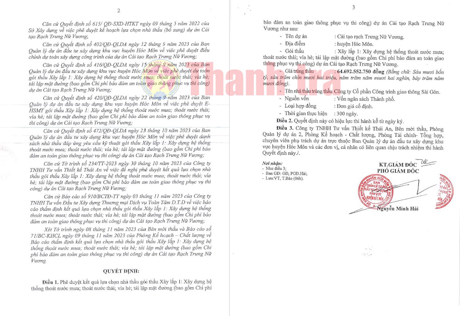 Ngày 14/11/2023, ông Nguyễn Minh Hải - Phó Giám đốc BQLDA huyện Hóc Môn đã ký quyết định phê duyệt cho công ty này trúng thầu với giá trúng thầu là hơn 64,692 tỷ đồng (giá gói thầu là hơn 65,148 tỷ đồng); tiết kiệm cho ngân sách Nhà nước hơn 450 triệu đồng, tương đương gần 0,7% giá gói thầu.