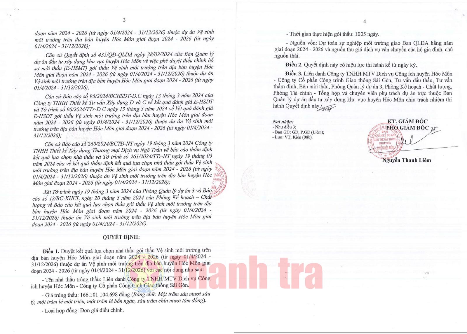Ngày 20/3/2024, ông Nguyễn Thanh Liêm - Phó Giám đốc BQLDA huyện Hóc Môn đã ký quyết định phê duyệt cho liên danh này trúng thầu với giá trúng thầu là hơn 166,1 tỷ đồng (giá gói thầu là hơn 166,6 tỷ đồng); tiết kiệm được hơn 500 triệu đồng, tương đương 0,3% giá trị gói thầu.