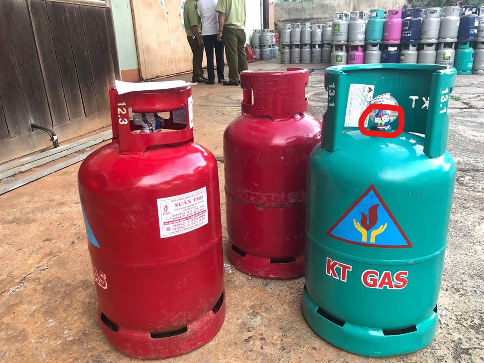 Những bình gas (chai LPG) bắt đầu bán ra trên địa bàn tỉnh Đắk Lắk từ tháng 7/2019 bắt buộc phải dán tem Hiệp hội Gas Đắk Lắk (trong ô màu tròn đỏ có lô gô Hiệp hội) nếu không sẽ bị xử phạt. Ảnh: ND