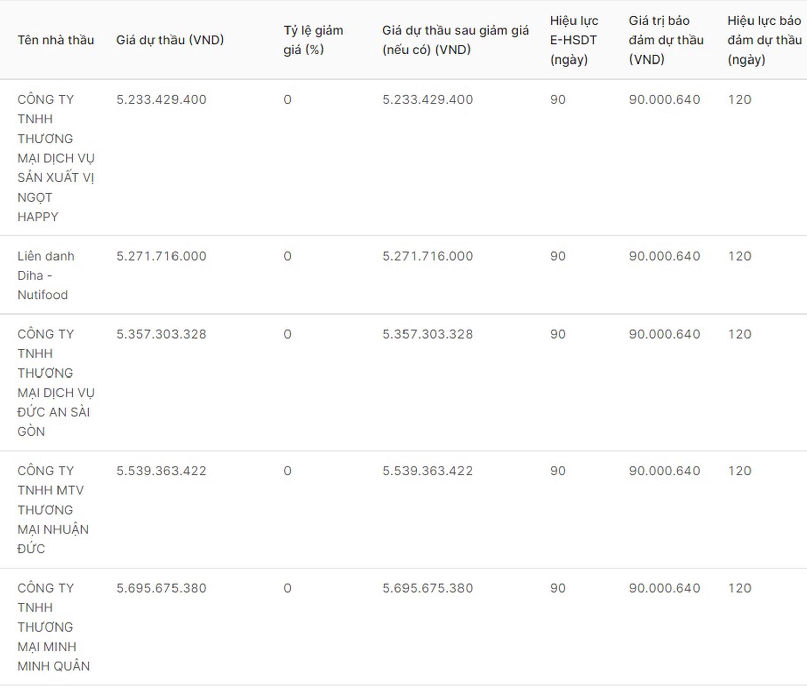 Thông tin trên mạng đấu thầu quốc gia cho thấy, tại biên bản mở thầu vào ngày 14/6/2024, đã có 05 đơn vị tham gia đấu thầu gói thầu này. Công ty TNHH Thương mại Dịch vụ Sản xuất Vị ngọt Happy là đơn vị có giá dự thầu thấp nhất với số tiền là hơn 5,233 tỷ đồng.