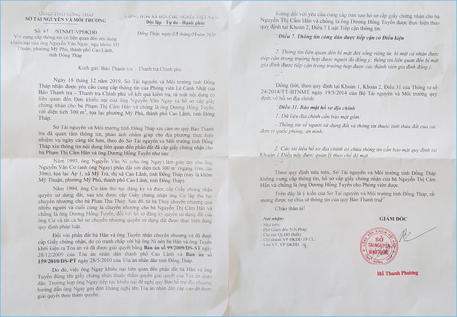 Văn bản của Sở TN&MT Đồng Tháp gửi Báo Thanh tra. Ảnh: NK