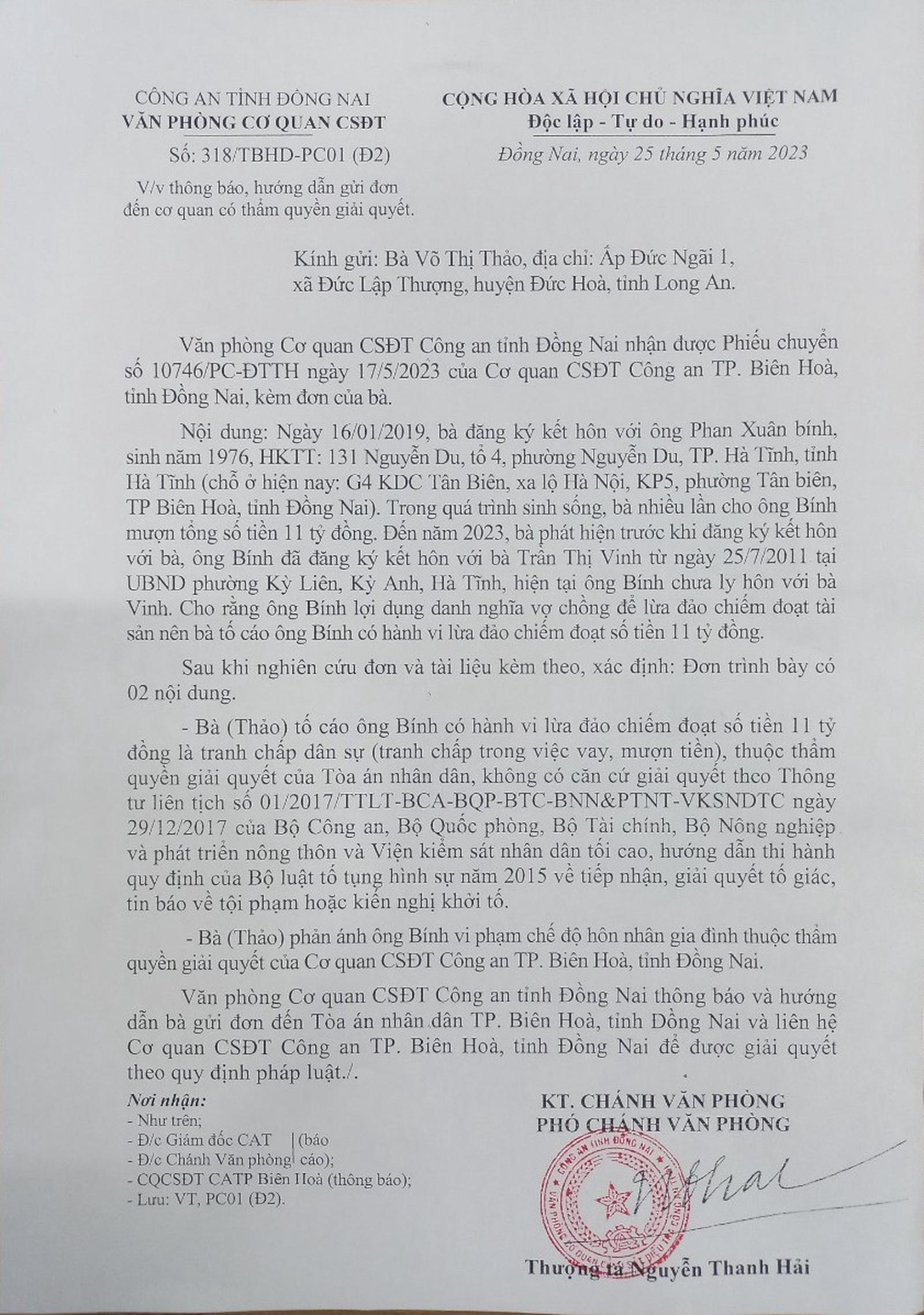 Liên quan đến vấn đề này, ngày 26/10/2023, làm việc với Báo Thanh tra, đại diện UBND phường An Hòa, TP Biên Hòa, tỉnh Đồng Nai, cung cấp thông tin: Việc xác nhận hôn nhân cho ông Bính và bà Thảo là đúng thủ tục. Thời điểm đó, cả 2 người có xuất trình các giấy tờ chứng minh việc đã ly hôn, đồng thời phường có gửi công văn về địa phương nơi ông Bính cư trú đề nghị xác minh tình trạng hôn nhân, sau đó mới tiến hành thủ tục xác nhận đăng ký kết hôn cho hai người này.
