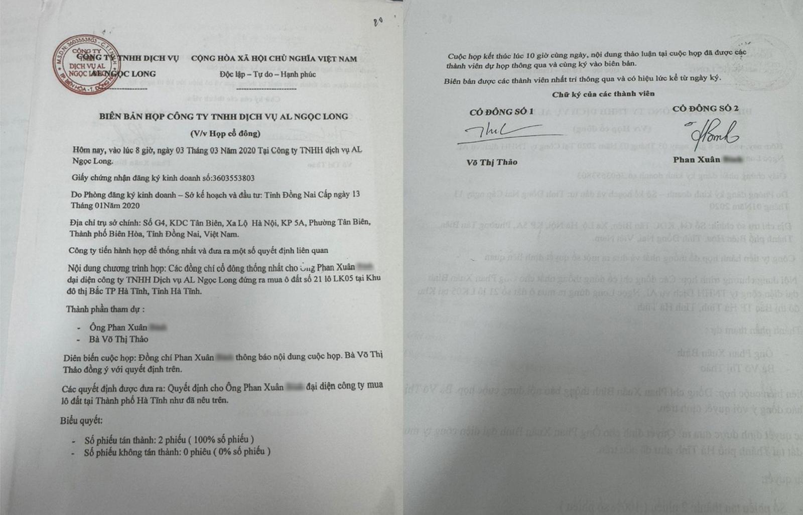 Nghi ngờ sự khuất tất về hồ sơ pháp lý xin cấp giấy chứng nhận quyền sử dụng đất mang tên Công ty AL Ngọc Long, bà Thảo quay về tìm hiểu hồ sơ tại Sở Tài nguyên và Môi trường Hà Tĩnh thì phát hiện, vào ngày 03/3/2020, ông Bính tự xây dựng một biên bản về cuộc họp cổ đông Công ty TNHH AL Ngọc Long với biểu quyết cổ đông 100% tán thành.