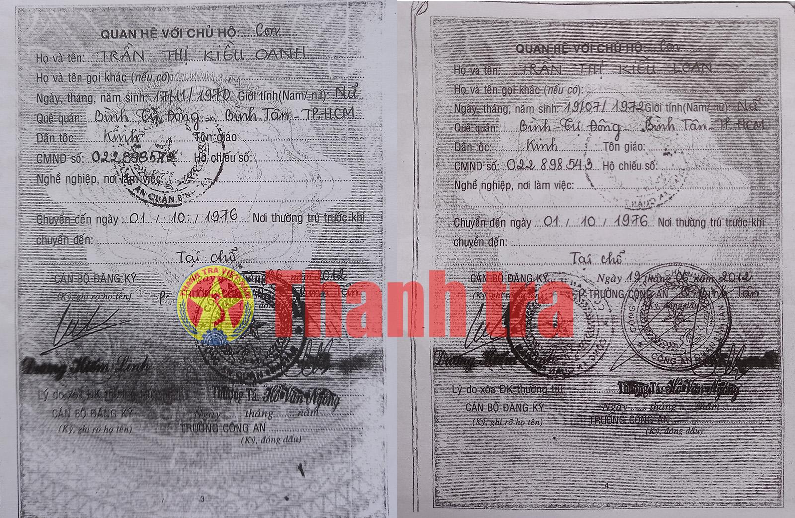 Sổ hộ khẩu số 31240022039 do Công an quận Bình Tân cấp ngày 19/6/2012 thể hiện bà Trần Thị Kiều Oanh và bà Trần Thị Kiều Loan là con của chủ hộ Trần Thị Tám, cùng chuyển nơi thường trú (số 103 Liên khu 10-11, khu phố 11, phường Bình Trị Đông, quận Bình Tân, TP Hồ Chí Minh) ngày 1/10/1976.