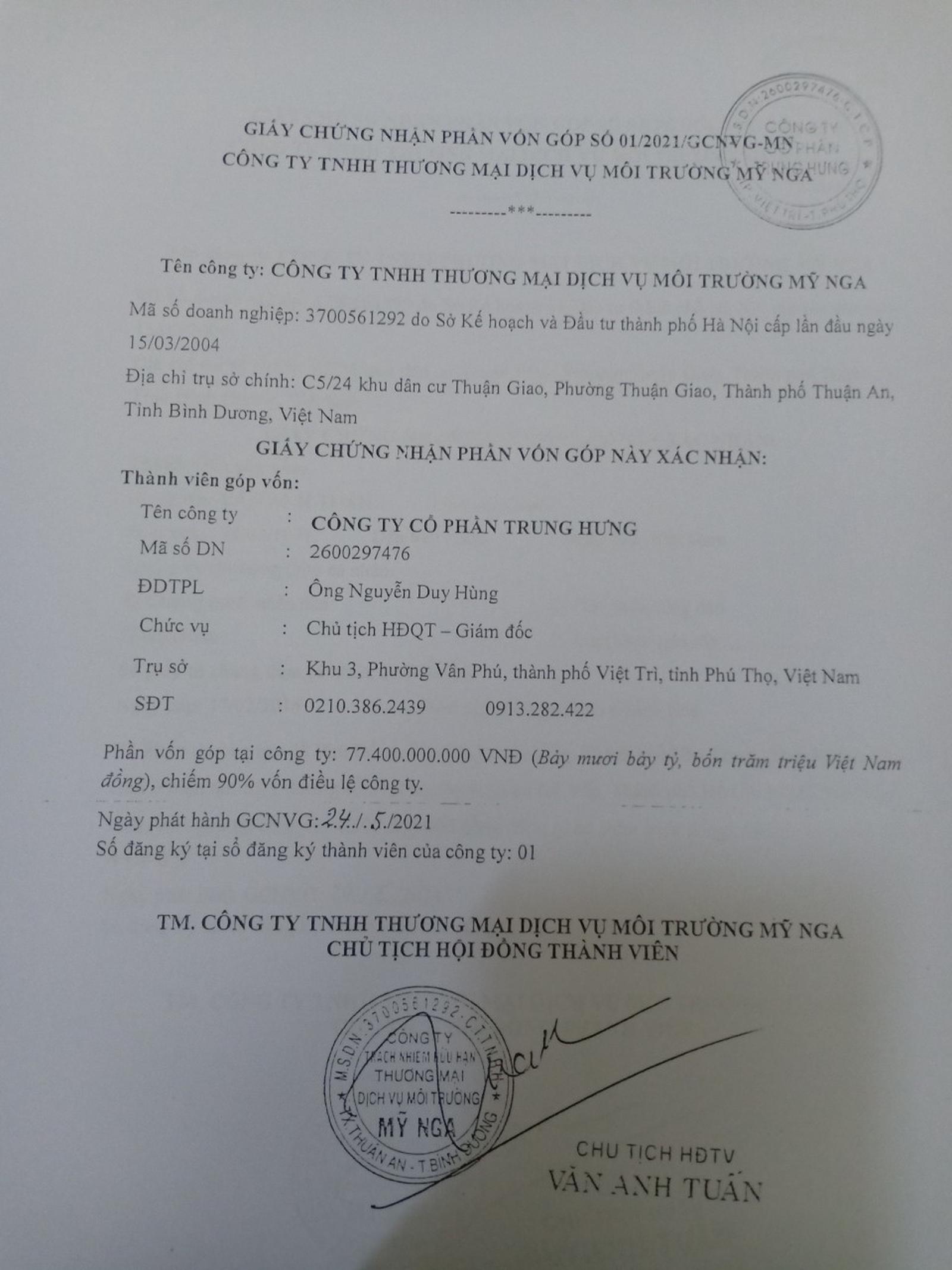 Theo đó, thành viên công ty và phần vốn góp sau khi chuyển nhượng gồm: Ông Văn Tuấn Anh sở hữu 5% cổ phần của Công ty Mỹ Nga tương đương 4,3 tỷ đồng; bà Nguyễn Thị Mỹ Nga sở hữu 5% cổ phần của Công ty Mỹ Nga tương đương 4,3 tỷ đồng; Công ty Cổ Phần Trung Hưng sở hữu 90% cổ phần của Công ty Mỹ Nga tương đương 77 tỷ 400 triệu đồng. Hội đồng Thành viên Công ty TNHH Thương mại dịch vụ môi trường Mỹ Nga đã bầu ông Nguyễn Duy Hùng làm Chủ tịch Hội đồng Thành viên.