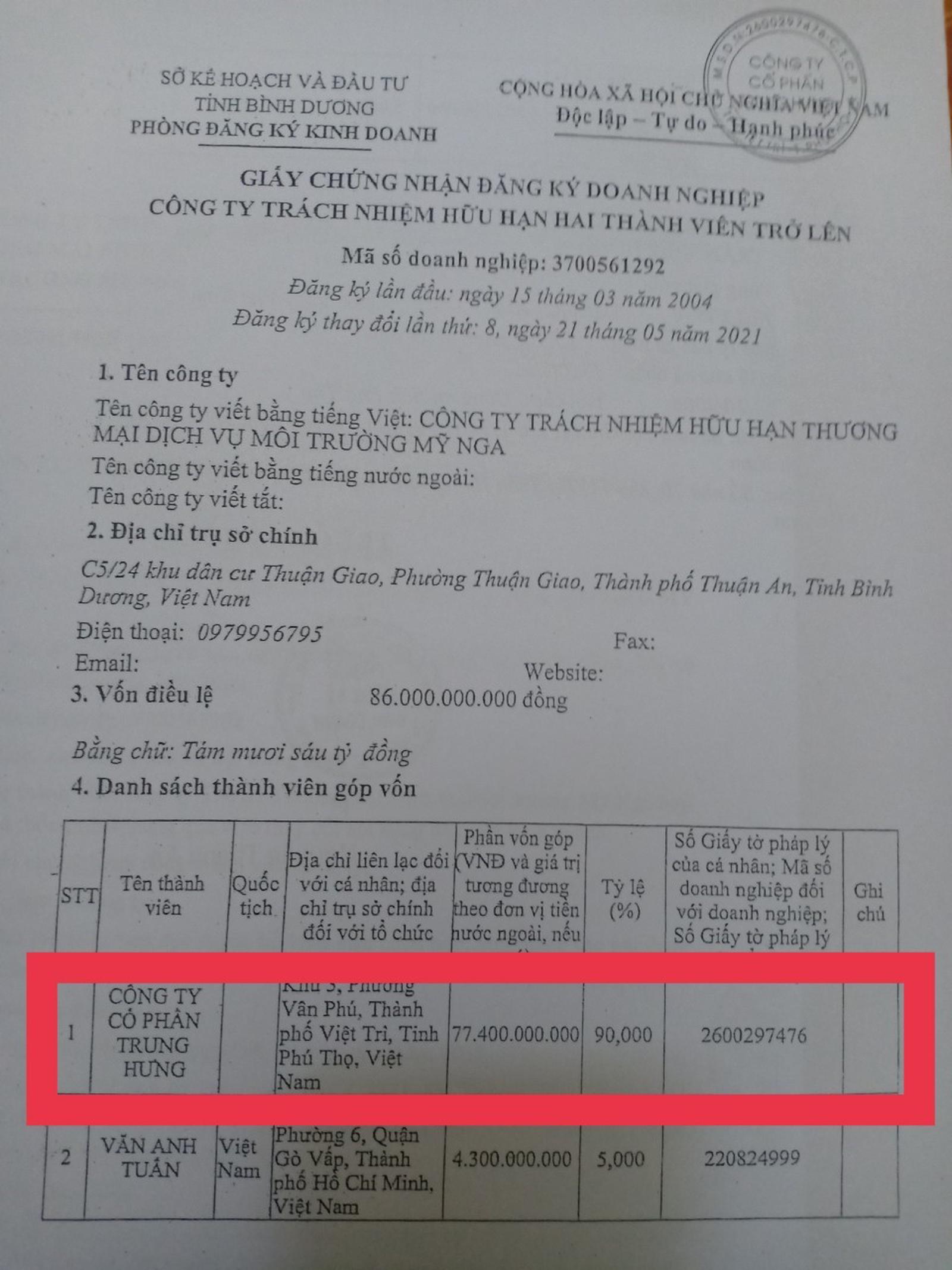 Sau khi hoàn tất các thủ tục thay đổi nội dung đăng ký doanh nghiệp và người đại diện công ty, Phòng Đăng ký kinh doanh cấp giấy chứng nhận đăng ký doanh nghiệp Công ty Trách nhiệm hữu hạn hai thành viên trở lên. Nội dung xác nhận danh sách thành viên góp vốn là Công ty Cổ phần Trung Hưng (90% cổ phần), ông Văn Anh Tuấn và bà Nguyễn Thị Mỹ Nga mỗi người 5% cổ phần. Người đại diện theo pháp luật của công ty là ông Trần Việt Hùng giữ chức vụ Tổng Giám đốc.