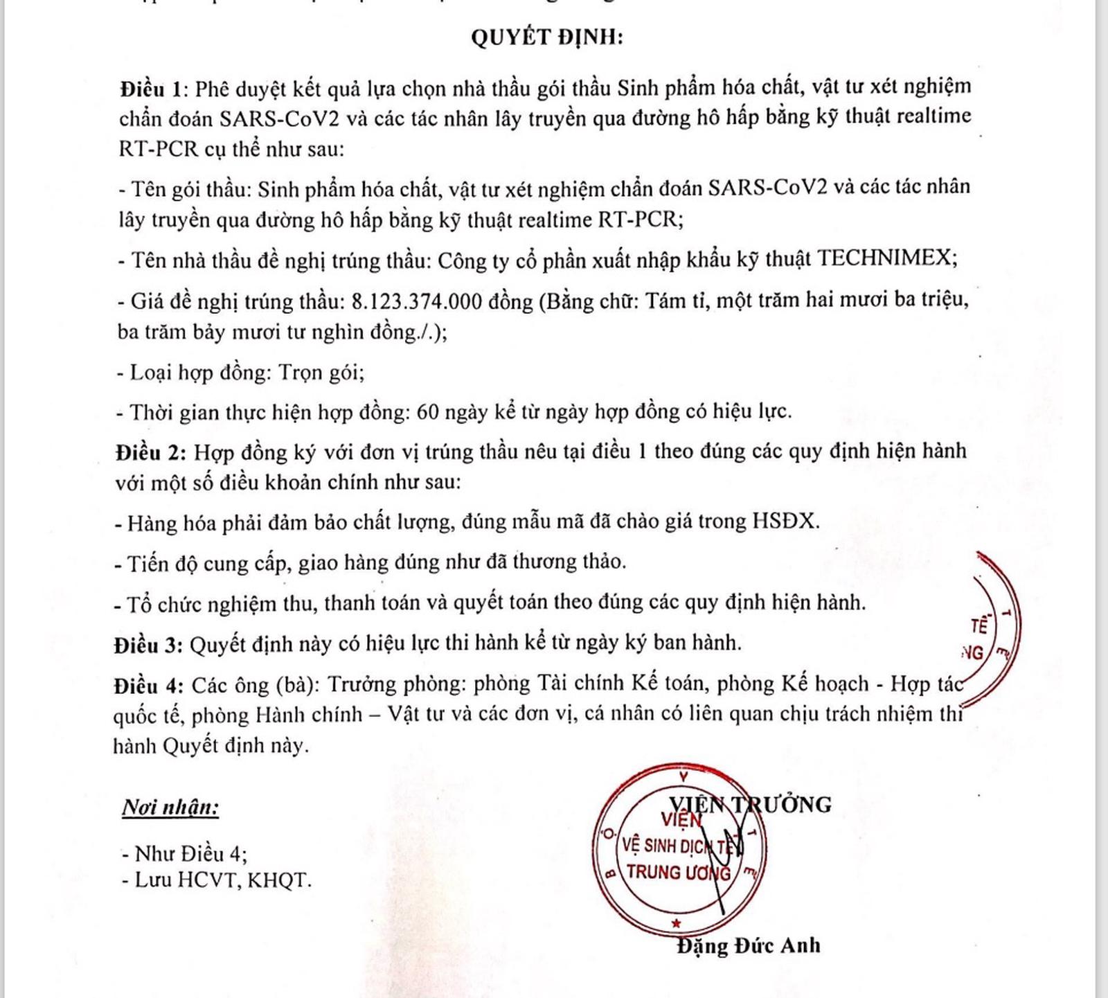 Đơn cử, Gói thầu “Sinh phẩm hóa chất, vật tư xét nghiệm chẩn đoán SARS-CoV2 và các tác nhân lây truyền qua đường hô hấp bằng kỹ thuật realtime RT-PCR”. Tại Quyết định 1493/QĐ-VSDTTƯ ký ngày 26/10/2020, lãnh đạo Viện Vệ sinh dịch tễ Trung ương đã phê duyệt Technimex là nhà thầu trúng thầu.