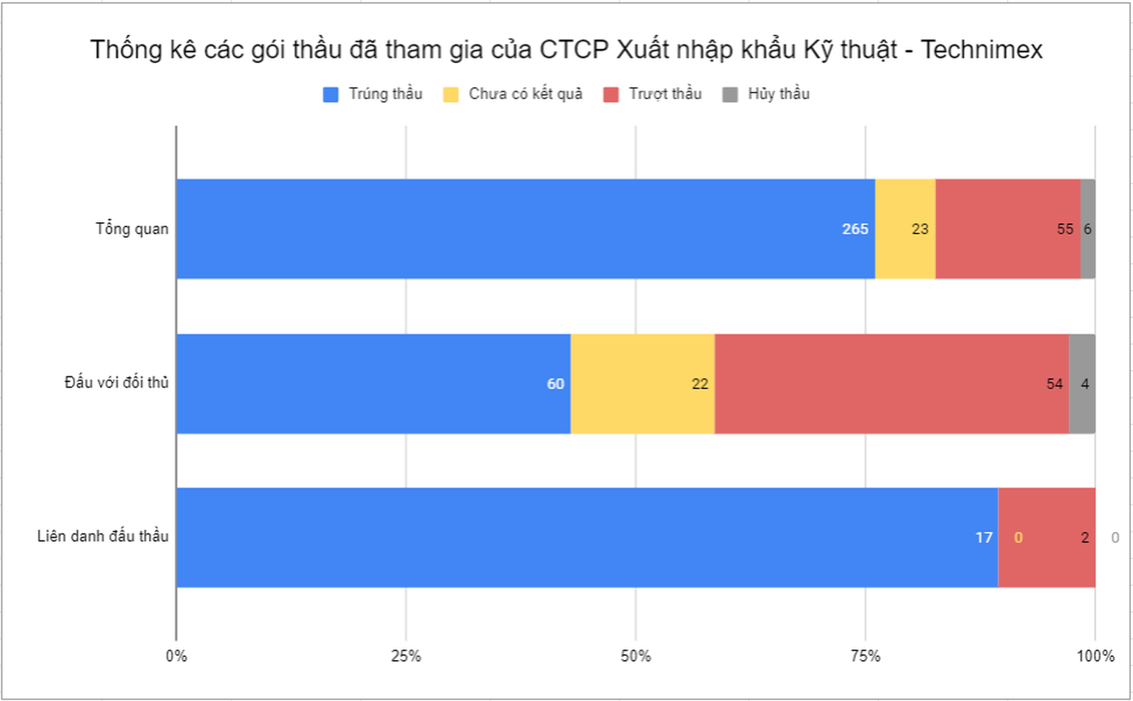 Qua tìm hiểu và thống kê cho thấy, Technimex đã tham gia 349 gói thầu, trong đó trúng 265 gói, trượt 55 gói, 23 chưa có kết quả, 6 gói đã bị huỷ. Tổng giá trị trúng thầu là hơn 1.171 tỷ đồng. Trong đó tổng giá trị trúng thầu với vai trò độc lập là hơn 709 tỷ đồng, tổng giá trị các gói thầu đã tham gia và trúng thầu với vai trò liên danh là hơn 461 tỷ đồng. Technimex cũng có quan hệ với 122 bên mời thầu với tỷ lệ giá trúng thầu so với giá dự toán là 83,06%.