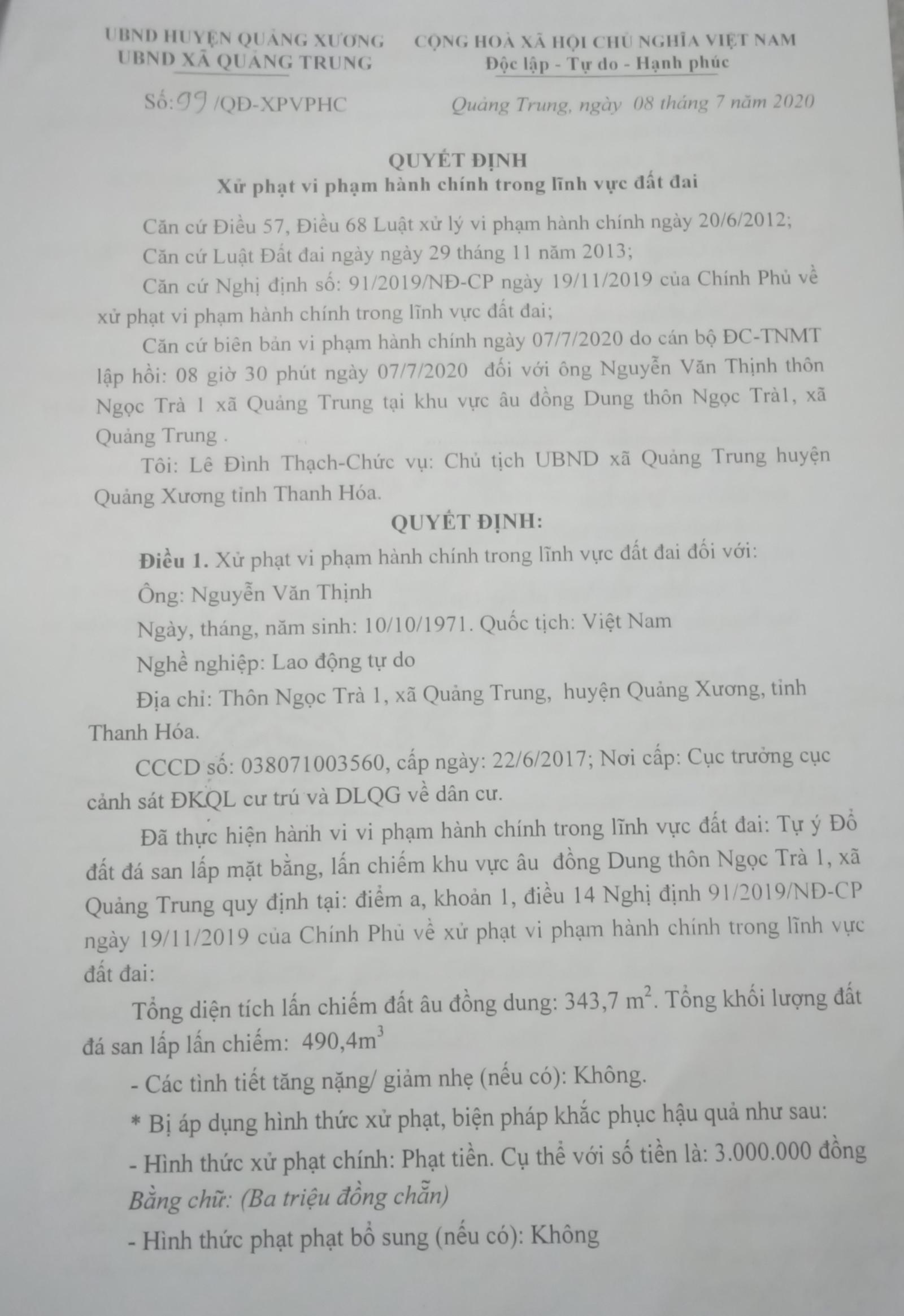 Trước việc vi phạm nghiêm trọng này, ngày 7/7/2020 chính quyền xã Quảng Trung đã có biên bản kiểm tra, phát hiện việc hộ ông Nguyễn Văn Thịnh, công dân thôn Ngọc Thành tự ý đổ đất đá san nền tại khu Âu cống đồng Dung, thôn Ngọc Trà 1.
