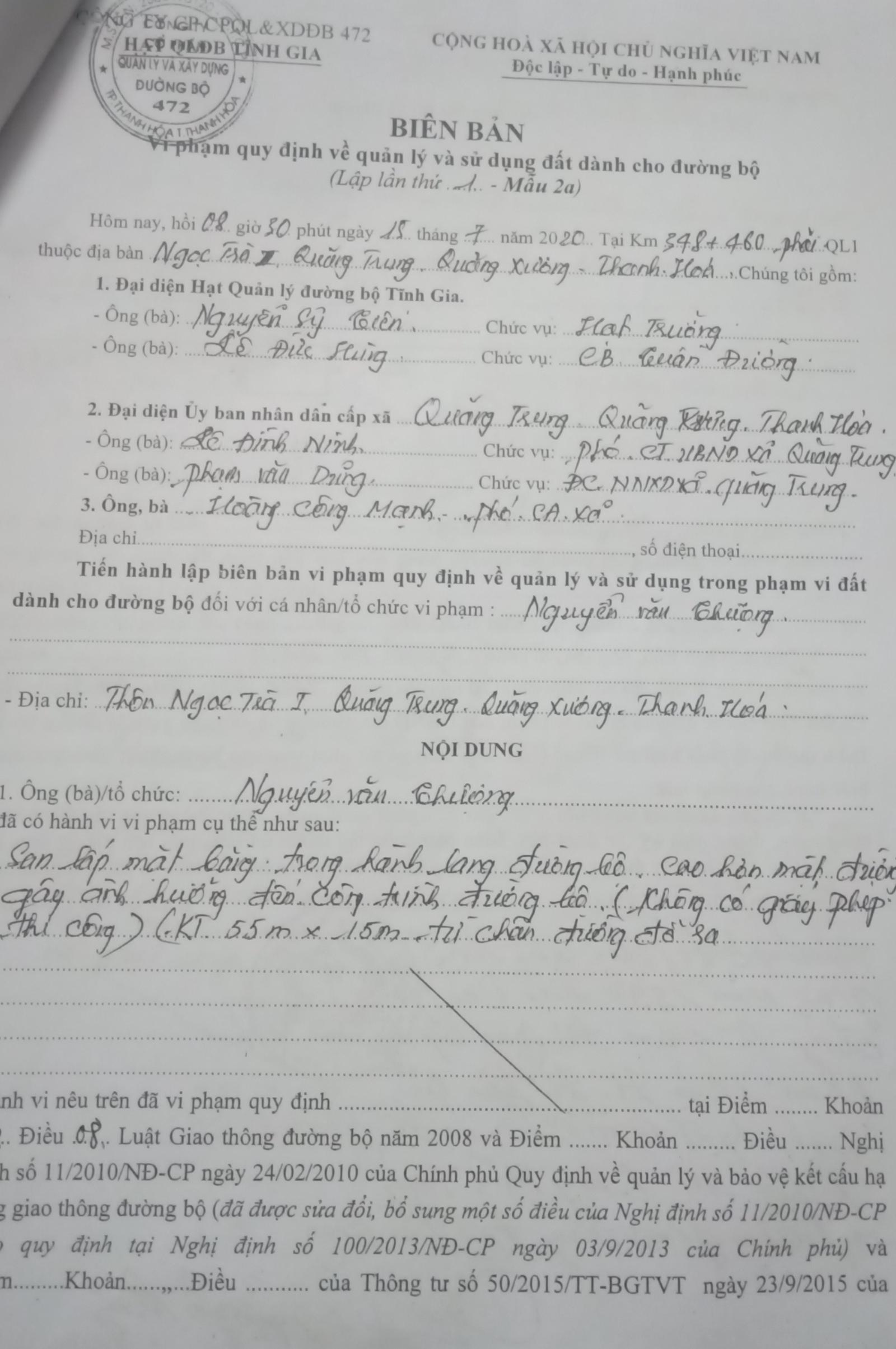 Trước việc vi phạm này, Hạt Quản lý đường bộ Tĩnh Gia đã phối hợp với chính quyền xã Quảng Trung lập biên bản vi phạm đối với ông Thượng về hành vi san lấp mặt bằng trong hành lang đường bộ, cao hơn mặt đường, ảnh hưởng đến công trình đường bộ, san lấp khi không có giấy phép, vi phạm Khoản 2, Điều 8, Nghị định số 11/2010/NĐ-CP quy định về quản lý và bảo vệ kết cấu hạ tầng giao thông đường bộ.