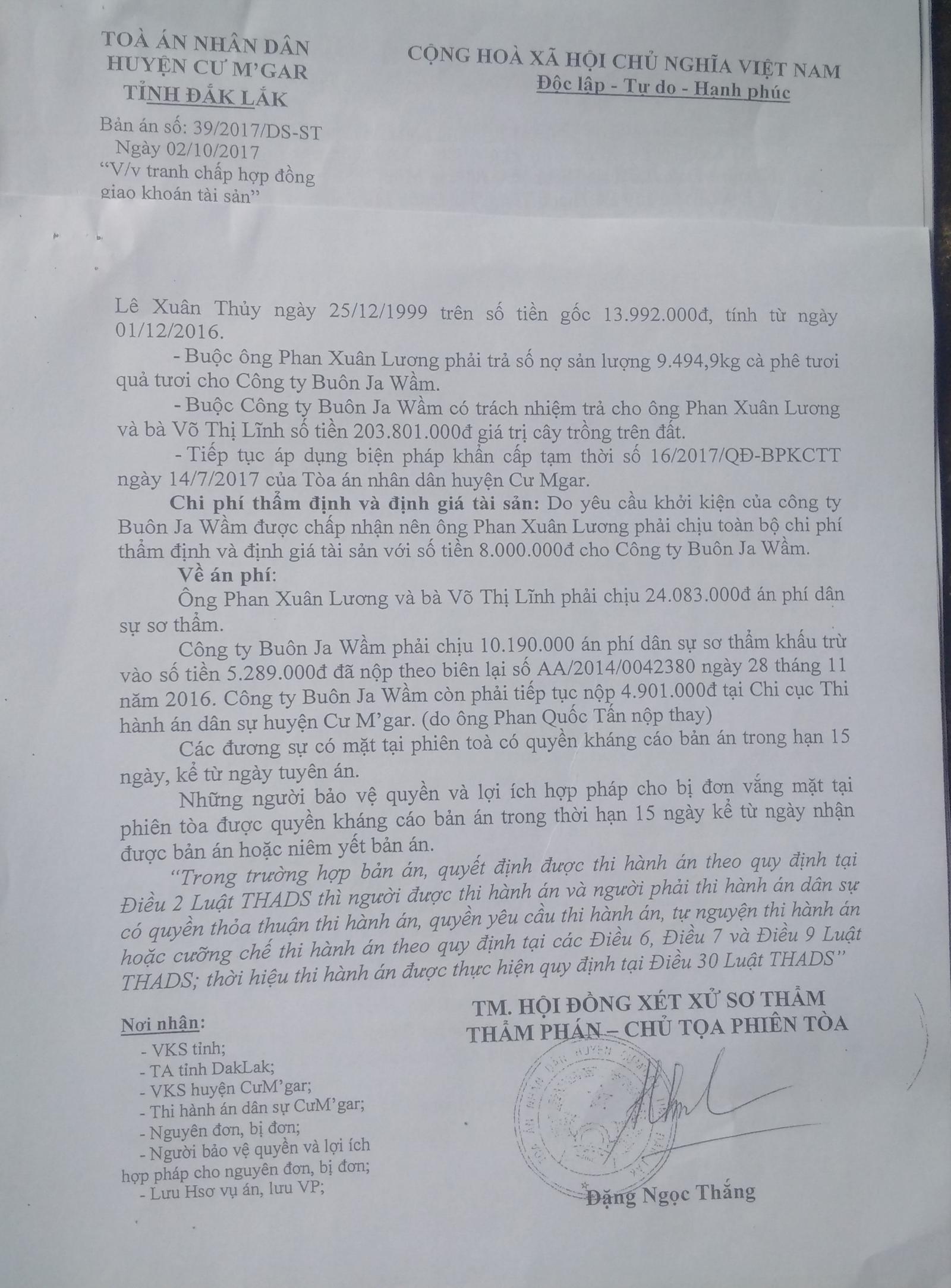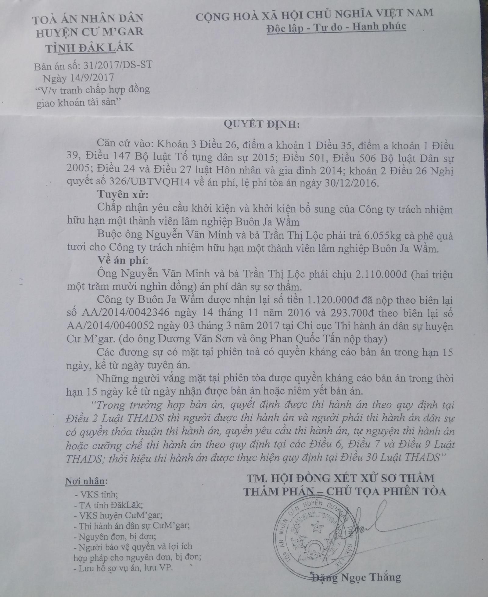 Trong 4 bản án đã tuyên, Tòa án nhân dân huyện CưM’gar đều chấp nhận yêu cầu khởi kiện của Công ty Lâm nghiệp Buôn Ja Wầm; buộc các bị đơn Phan Xuân Lương, Nguyễn Văn Minh, Lê Văn Dương, Nguyễn Văn Đạt phải trả số sản lượng cà phê mà các hộ nhận khoán này đã nợ của công ty.