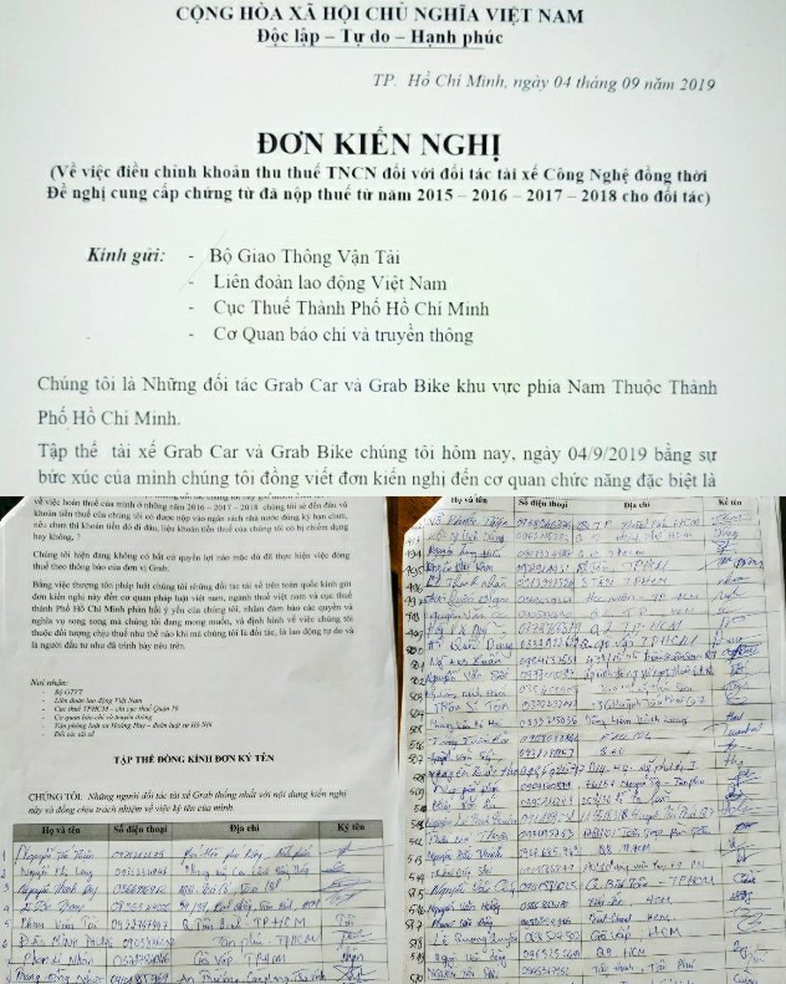 Đó là nội dung đơn kiến nghị của hơn 500 tài xế (xe máy, xe ô tô) là đối tác của Cty TNHH Grab (Grab).