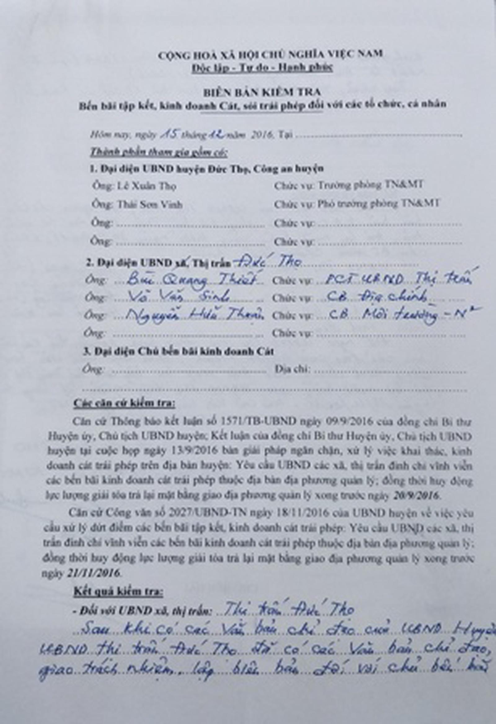 Máy móc ngang nhiên hoạt động trước bãi tập kết cát. Ảnh: Tăng Thành Biên bản xử lý năm 2016 của UBND huyện Đức Thọ. Ảnh: Tăng Thành