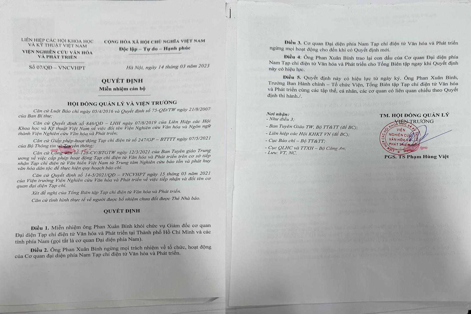 Quyết định miễn nhiệm chức vụ Giám đốc Cơ quan đại diện Tạp chí điện tử Văn hóa và Phát triển tại TP HCM và các tỉnh phía Nam. Ảnh: PV