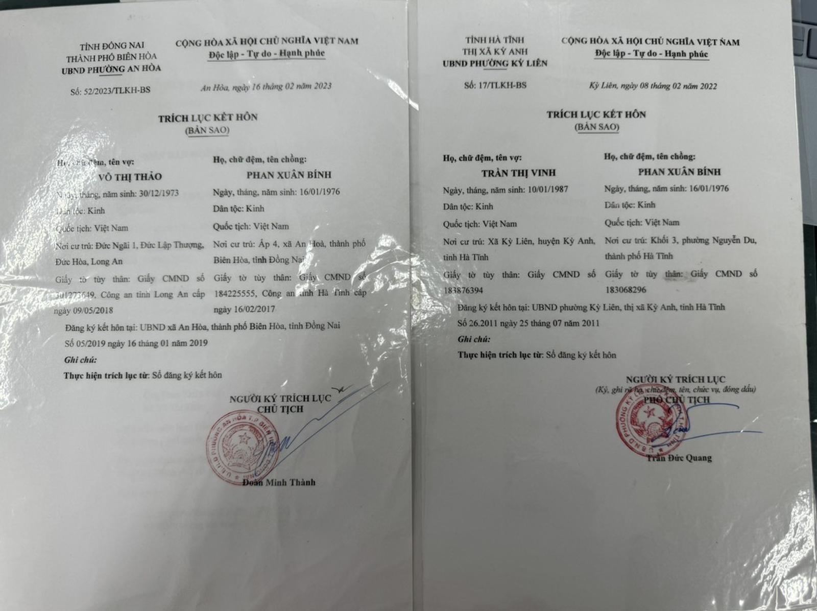 Qua quá trình xác minh bà Thảo phát hiện, ngoài kết hôn và li hôn với vợ đầu, ông Bính còn có một người vợ khác kết hôn năm 2011, hai người có 3 người con chung.