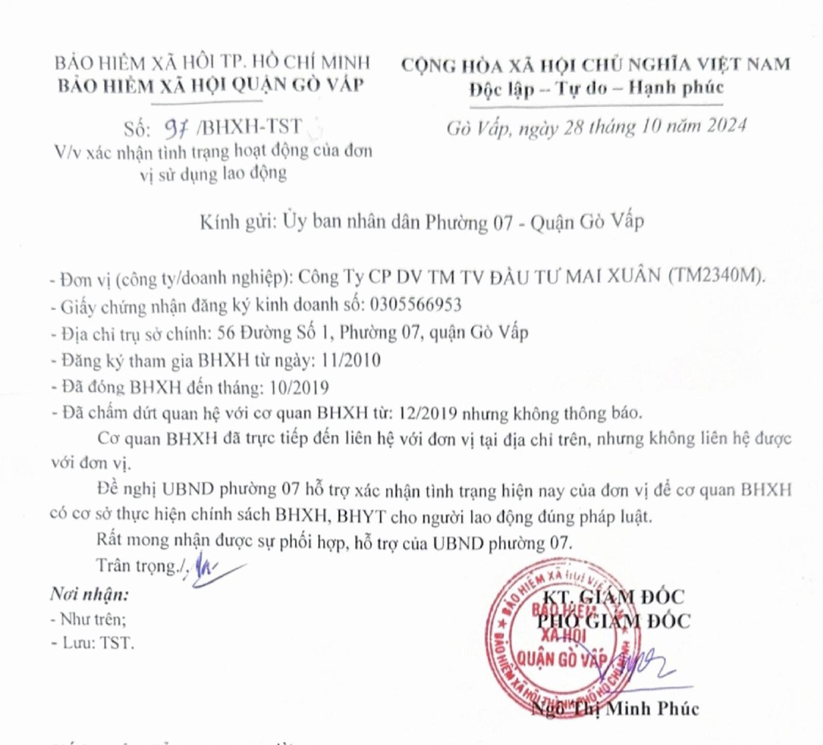 Ngày 28/10/2024, Phó Giám đốc Bảo hiểm xã hội quận Gò Vấp Ngô Thị Minh Phúc đã có Công văn số 97/BHXH-TST gửi UBND Phường 7, quận Gò Vấp để đề nghị xác nhận tình trạng lao động của Cty Mai Xuân tại địa chỉ 56 đường số 1, Phường 7, Gò Vấp, Thành phố Hồ Chí Minh. Cơ quan Bảo hiểm xã hội quận Gò Vấp xác nhận, Cty Mai Xuân đăng ký tham gia bảo hiểm xã hội từ tháng 10/2010, đã đóng bảo hiểm xã hội đến tháng 10/2019, tuy nhiên đến tháng 12/2019 thì chấm dứt quan hệ với cơ quan bảo hiểm xã hội nhưng không có thông báo.