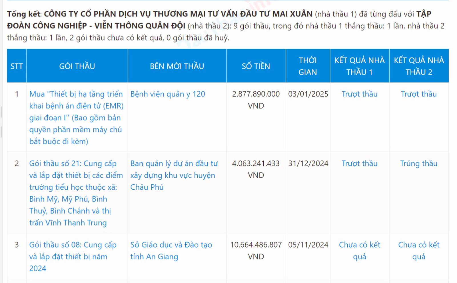 Thời điểm 9 ngày đầu năm 2025, Cty Mai Xuân đã nhanh chóng tham gia 4 gói thầu sử dụng vốn ngân sách, do Bệnh viện Quân y 120, Ban Quản lý dự án và Phát triển quỹ đất thành phố Mỹ Tho, Ban Quản lý dự án đầu tư xây dựng và Khu vực phát triển đô thị tỉnh An Giang, UBND xã Phước Thạnh (huyện Củ Chi, Thành phố Hồ Chí Minh) làm chủ đầu tư/ bên mời thầu.