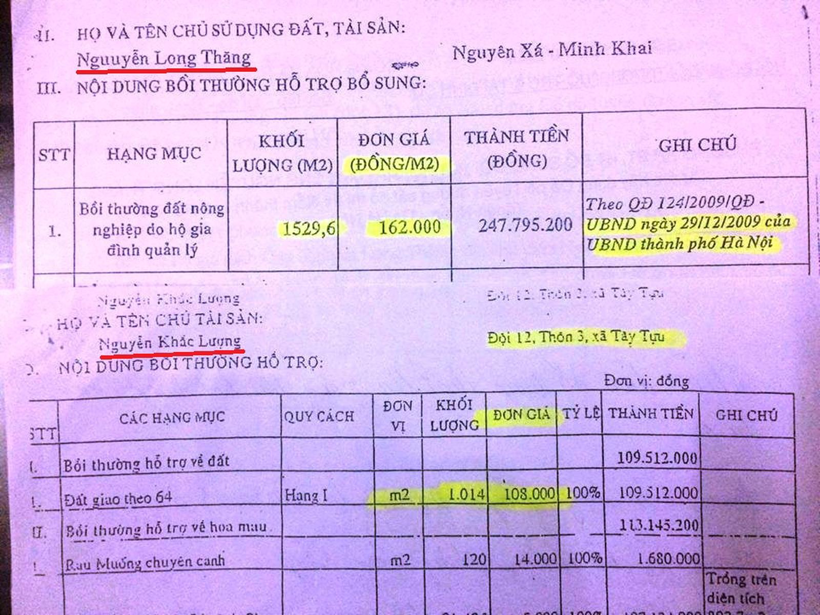 Theo danh sách mà ông Lê Văn Việt, Chủ tịch UBND phường Tây Tựu ký ngày 27/9/2014, trong số 120 hộ dân có đất bị thu hồi có tới hơn 80 hộ gia đình có tỷ lệ đất nông nghiệp bị thu hồi lớn hơn 30%. Trong đó có hộ gia đình ông Nguyễn Khắc Lượng bị thu hồi 1.014m2 trong tổng số 1.950m2 đất nông nghiệp (chiếm tỷ lệ 53%) theo Quyết định số 6267 ngày 31/12/2007.