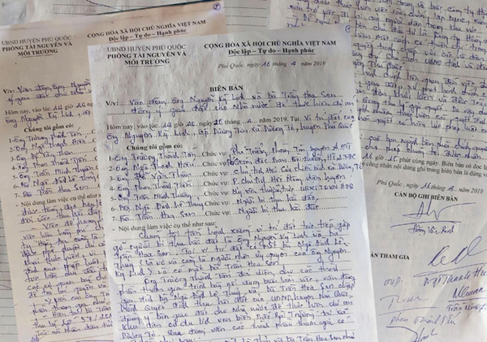 Biên bản cơ quan chức năng huyện Phú Quốc vận động các hộ dân bàn giao đất để thực hiện Dự án Khu du lịch ven biển Bắc Bãi Trường. Ảnh: Nhóm PV