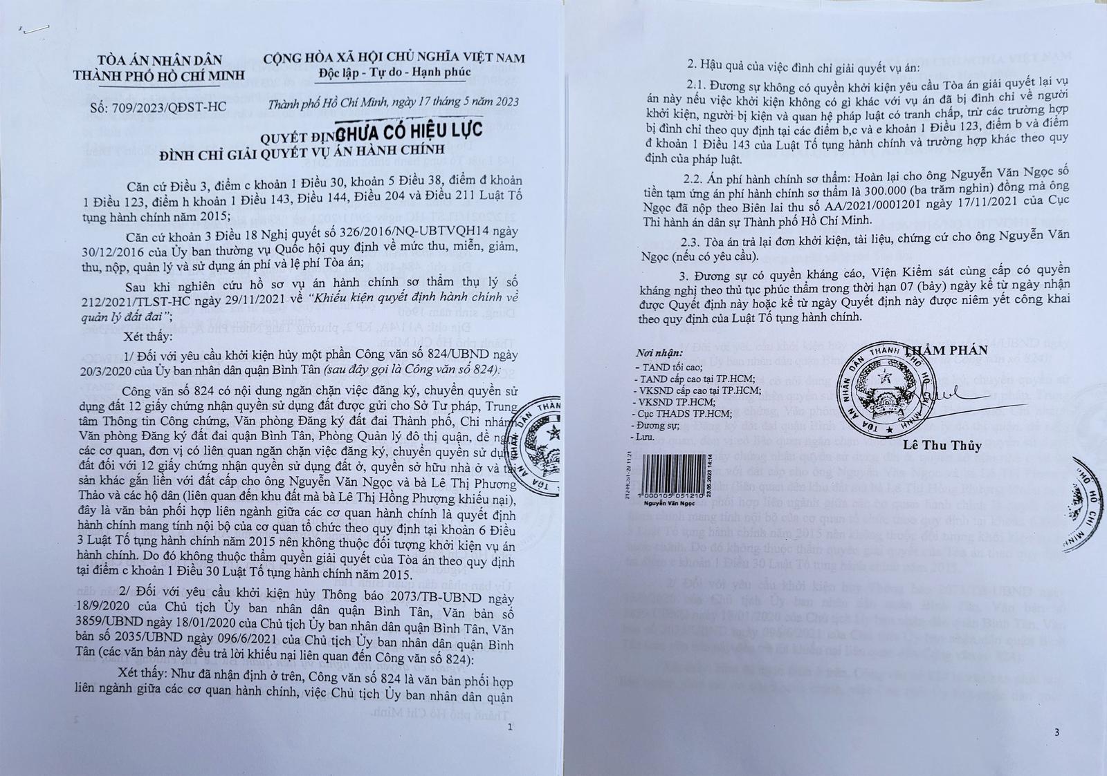 Ngày 16/6/2023, TAND TP HCM xét xử sơ thẩm và tuyên chấp nhận toàn bộ đơn khởi kiện của bà Phạm Thị Nở về việc UBND quận Bình Tân thu hồi GCNQSDĐ số CH02065 cấp cho ông Nguyễn Văn Nhờ và bà Phạm Thị Nở tại thửa 528 tờ bản đồ số 61 (TL2005), phường An Lạc A, quận Bình Tân với diện tích 1.048,6m2.