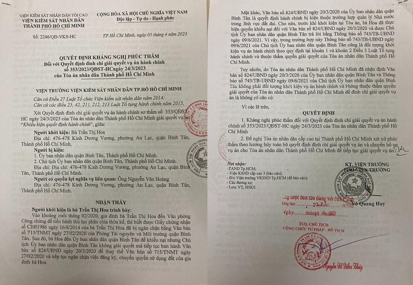 TAND TP HCM đình chỉ vụ án với lý do Công văn 824/UBND ngày 20/3/2020 của UBND quận Bình Tân không phải đối tượng khởi kiện vụ án hành chính và không thuộc thẩm quyền của TAND TP HCM. Hiện, VKSND TP HCM đã ra quyết định kháng nghị phúc thẩm đối với các quyết định đình chỉ giải quyết vụ án hành chính sơ thẩm của TAND TP HCM. Theo đó, VKSND TP HCM đề nghị TAND Cấp cao tại TP HCM xét xử phúc thẩm theo hướng hủy toàn bộ quyết định đình chỉ giải quyết vụ án của TAND TP HCM và yêu cầu tòa này tiếp tục giải quyết vụ án.